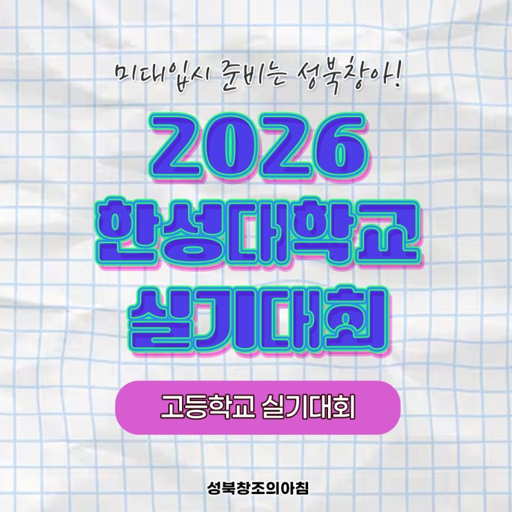 안녕하세요. 성북창조의아침 미술학원입니다. 2026년 한성대 미대 실기대회 소식이 들려왔습니다. 아트앤디자인 홈페이지에 공식적으로 올라왔고 대회일시, 대회장소, 참가방법 등을 자세하게 알려드리겠습니다. 2026 한성대 실기대회 개최! 한성대 실기대회는 전국 고등학교 남녀 재학생 및 졸업생을 대상으로 진행하는 실기대회로 검정고시 합격생도 지원 가능합니다. 대회는 한성대에서 진행하는 현장 실기대회로 2026년 6월 14일 일요일에 진행하며 오전, 오후 나눠서 진행합니다. 오전은 9시부터 13시까지 오후는 15시부터 19시까지입니다. 시험시간은 총 4시간입니다. 오전, 오후 둘 다 중복 접수 가능합니다. 접수는 아트앤디자인 홈페이....... <img src="https://blogthumb.pstatic.net/MjAyNjA0MjBfNDkg/MDAxNzc2Njg3MjAzNDU0.AEUvzefYKSisAfJol1tCaH72pFfQ4tq0vop8PrPxzOIg.BSk0mAduxMuB_shsEeAdX6LlNaLFbJILXYhCmlu9xy0g.JPEG/2026_%C7%D1%BC%BA%B4%EB_%BD%C7%B1%E2%B4%EB%C8%B8_%281%29.jpg?type=s3" />