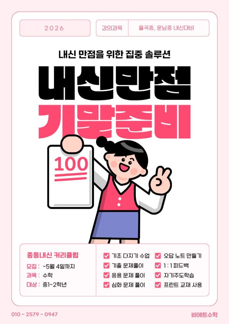 중간고사가 시작되기도 전에, 우리가 기말고사를 이야기하는 이유 안녕하세요! 비에트수학입니다. 약 10일 후에는 율곡동 내 학교의 중간고사가 시작됩니다. 우리 학생들도, 원장인 저도 책임감을 가지고 밤낮, 주말할 것 없이 막바지 총력전을 펼치고 있는 시기입니다. 저희는 왜 지금! '기말고사 대비반' 모집을 시작했을까요?! 1. 중간고사의 결과는 기말고사의 예고편입니다 중간고사에서 발견된 취약점은 기말고사 범위인 함수 파트에서 더 크게 드러나곤 합니다. 시험이 끝나고 결과에 일희일비하며 시간을 보내기보다 바로 그 다음 스텝을 설계하는 것이 성적 역전의 유일한 방법입니다. 2. 골든 타임을 놓치지 마세요 중간고사....... <img src="https://blogthumb.pstatic.net/MjAyNjA0MTJfODgg/MDAxNzc1OTIxMjgyNzc1.sTZCL1tisrnfqXKHF2NRJo-RDSzHrJ1orMKVmknF5P4g.ZozqBgyAXngllhY6xU2EqBn6F0PiVtZWuJhNR-HSQyUg.JPEG/%C1%A6%B8%F1%C0%BB_%C0%D4%B7%C2%C7%D8%C1%D6%BC%BC%BF%E4..jpg?type=s3" />