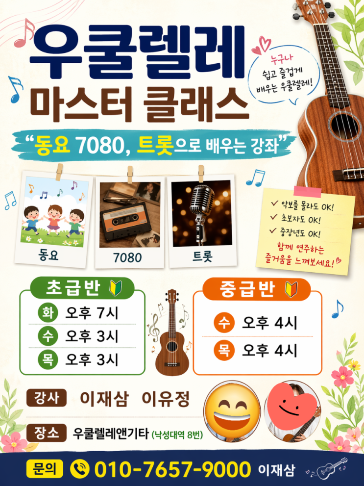 우쿨렐레 마스터 클래스(초급반&중급반) ●그룹레슨 안내 / 월5만원 / 주1회(50분) ●대상: 어린이, 청소년, 성인, 중장년, 시니어 ●교육: 동요 가요 트롯등 기초부터 중급까지 ●개강: 3명이 모이면 개강합니다. ●장소: 우쿨렐레앤기타(낙성대역8번,3층) 초급반 / 선택 -화요반 / 오후7:00~7:50 / 월4회(주1회) -수요반 / 오후3:00~3:50 / 월4회(주1회) -목요반 / 오후3:00~3:50 / 월4회(주1회) 중급반 / 선택 -수요반 / 오후4:00~4:50 / 월4회(주1회) -목요반 / 오후4:00~4:50 / 월4회(주1회) 강사: 이재삼선생, 이유정선생 -백석대음악학박사과정(Ph.D) -YWCA봉천종합사회복지관우쿨렐레강사 -관악50플러스센터우쿨렐레....... <img src="https://blogthumb.pstatic.net/MjAyNjA0MjRfMjA5/MDAxNzc2OTU4MjMxNjgw.UnwTEDW8GOBY07fKg3Xu-38zsqOH4oxfB-d2r0EB7NAg.V2WxH5zzWRc-cJ6UuA5WmjTWDjUAI2mOdLA7XEKeQ-Eg.PNG/900_1776956725452.png?type=s3" />