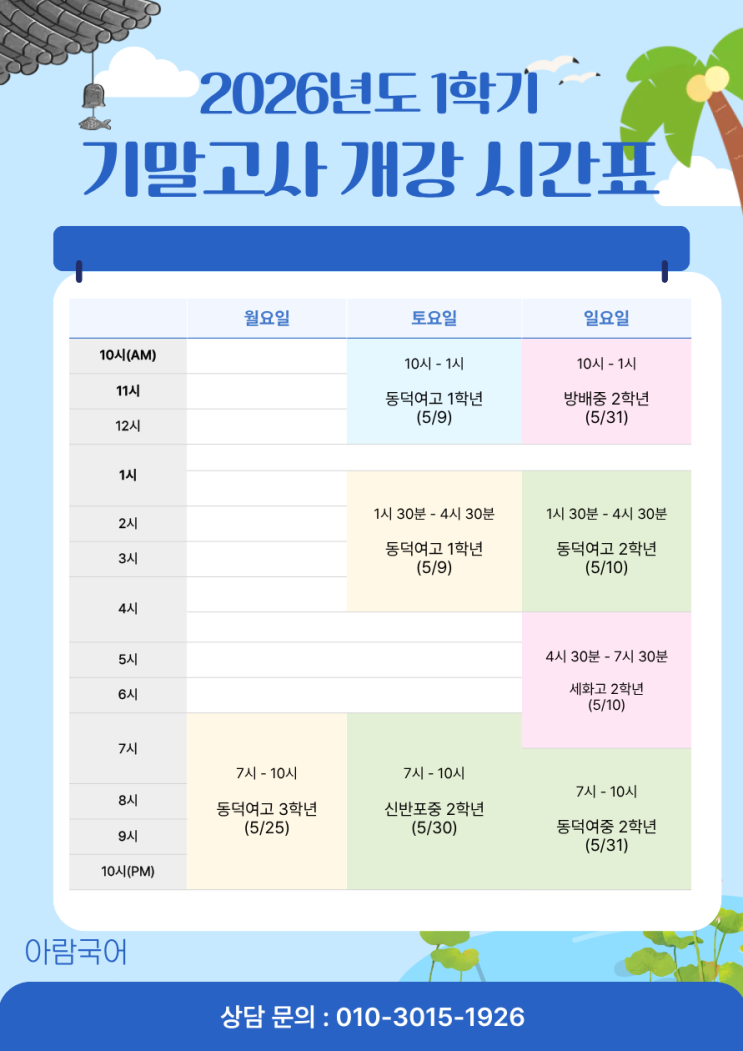 앎이 되는 진짜 국어 아람국어입니다 오늘은 26년 1학기 기말고사 개강 및 정규반 시간표를 안내드립니다. <1학기 기말고사 개강 시간표> ✅ 동덕여고 수업 동덕여고 1학년 (5월 9일 개강 ) (토) 10:00-13:00 or (토) 13:30-16:30 동덕여고 2학년 (5월 10일 개강) (일) 13:30-16:30 동덕여고 3학년 (5월 25일 개강) (월) 19:00-22:00 ✅ 세화고 수업 세화고 2학년 (5월 10일 개강) (일) 16:30-19:30 ✅ 중등부 수업 방배중, 세화여중 2학년 (5월 31일 개강) (토) 10:00-13:00 신반포중 2학년 (5월 30일 개강) (토) 17:00-22:00 동덕여중 2학년 (5월 31일 개강) (일) 19:00-22:00 <아람국어 정규반 시간표> 중 1 정규반 (토) 16:....... <img src="https://blogthumb.pstatic.net/MjAyNjA0MjRfNzEg/MDAxNzc3MDEwMjA0MjY4.aRlylVKc3s8ZQJcr0kvOXyOLHp2puKIyD-Y0Vkgvue8g.dNfVisUUZyVLMSBp8GHrmKEsy1VvCTrwBOC0iNZtbOcg.PNG/1.png?type=s3" />