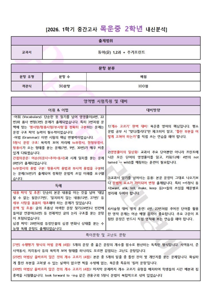 ★★[목운중2] 26' 1학기 중간고사 영어 내신분석 및 대비전략