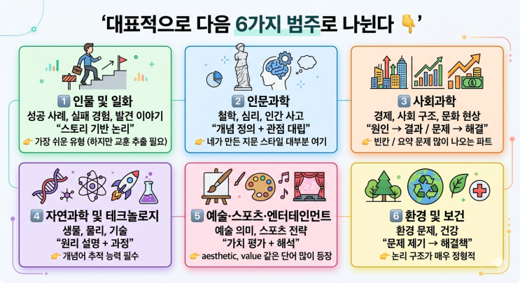 대표적으로 다음 6가지 범주로 나뉜다 1⃣ 인물 및 일화 성공 사례, 실패 경험, 발견 이야기 “스토리 기반 논리” 가장 쉬운 유형 (하지만 교훈 추출 필요) 2⃣ 인문과학 철학, 심리, 인간 사고 “개념 정의 + 관점 대립” 네가 만든 지문 스타일 대부분 여기 3⃣ 사회과학 경제, 사회 구조, 문화 현상 “원인 → 결과 / 문제 → 해결” 빈칸 / 요약 문제 많이 나오는 파트 4⃣ 자연과학 및 테크놀로지 생물, 물리, 기술 “원리 설명 + 과정” 개념어 추적 능력 필수 5⃣ 예술·스포츠·엔터테인먼트 예술 의미, 스포츠 전략 “가치 평가 + 해석” aesthetic, value 같은 단어 많이 등장 6⃣ 환경 및 보건 환경 문제....... <img src="https://blogthumb.pstatic.net/MjAyNjA0MjVfMyAg/MDAxNzc3MDkxODc3NDQ1.WvFv3AmO9RQmcNxODTzXYQWBP6GYxsK-EJzyNfcpJIQg.OUp1RPUTWeU5FW1geFtsC1JRJqiPGa-Afdx6TM2PZv4g.PNG/Gemini_Generated_Image_58hi1m58hi1m58hi.png?type=s3" />