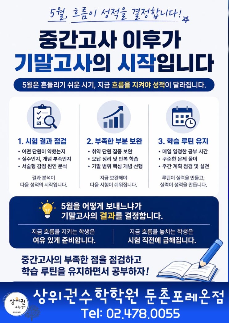 안녕하세요, 상위권수학학원입니다. 중간고사를 치르느라 고생한 우리 학생들, 결과에 상관없이 큰 산 하나를 넘은 것에 박수를 보냅니다. 하지만 시험이 끝났다는 해방감에 젖어 5월 한 달을 '쉬어가는 달'로 생각하고 있지는 않나요? 성적의 비약적인 향상은 시험 기간의 몰입도가 아니라, 시험 직후를 대하는 태도에서 결정됩니다. 중간고사가 끝난 직후는 학생들이 가장 방심하기 쉬운 시기이면서, 동시에 기말고사의 성패가 결정되는 골든타임이기도 합니다. "중간고사 이후, '진짜 실력'은 지금부터 만들어집니다." 다음 시험을 위해 지금 꼭 갖춰야 할 세 가지 마음가짐을 공유합니다. 1. 결과보다 '원....... <img src="https://blogthumb.pstatic.net/MjAyNjA0MjVfNDAg/MDAxNzc3MDgzODIwMzA2.AiezpGVQzjS7k5Ooy68wKCyzGWRCX_XQt2KNa1jbo58g.kRIsFw_LIrirEwattSfAuK4IdG8IW_k2r9LVVbA_JZog.JPEG/%C1%A6%B8%F1%C0%BB_%C0%D4%B7%C2%C7%D8%C1%D6%BC%BC%BF%E4._%2857%29.jpg?type=s3" />