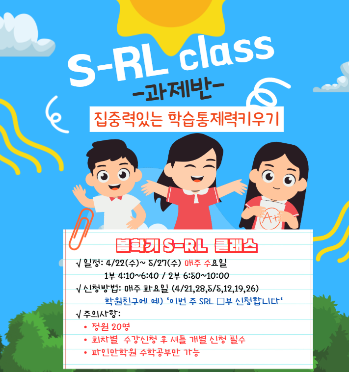 압구정파인만 SRL class 가 개강 했습니다. √ 일정: 4/22(수)~5/27(수) 매주 수요일 1부 , 2부 선택 가능합니다. √ 신청 방법: 매주 화요일 학원 친구에 ' 이번 주 SRL 1부 or 2부 신청 합니다.' 올려 주시면 됩니다. (* 담임선생님께 개별 신청 해주셔도 된답니다~!) √주의사항: 1. 정원은 20명입니다. 2. 파인만학원 수학공부만 학습 가능 합니다. 3. 태도가 좋지 않거나 학습에 방해되는 학생은 강제 퇴실 조취 되며, 다음 주 부터 수강이 불가능합니다. 학원에서 집중하여 학습하는 연습이 필요한 우리 학생들이 시간을 정해 와서 함께 하고 있습니다. 1부에는 부원장님이 2부에는 선생님들께서 돌아가며 담당을 정해 감독하고....... <img src="https://blogthumb.pstatic.net/MjAyNjA0MTdfNzUg/MDAxNzc2NDIwNjA3NTk4.94VT0vJHLITR377t3S2pjIO7463BsnLU964CFoLK5h8g.gzYinRquc5STPrQXzHtc2UudyG3VCICmyofAQJHjeA8g.PNG/image.png?type=s3" />