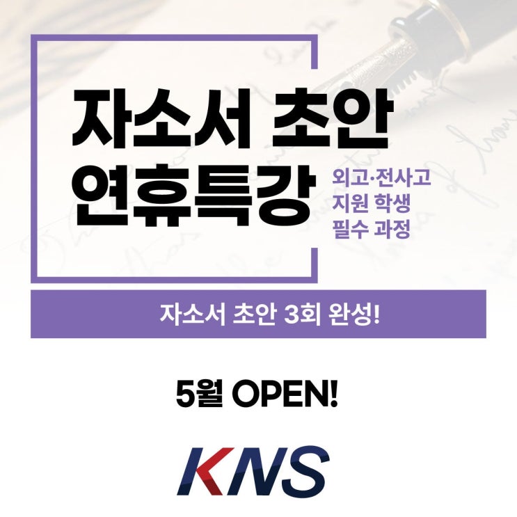 안녕하세요 KNS어학원입니다. [중3] 5월 중3 자소서초안반 프로그램 안내문 공유드립니다. 감사합니다. <img src="https://blogthumb.pstatic.net/MjAyNjA0MTdfMTMg/MDAxNzc2NDIwNjYxOTM1.ksllBZ_y34bGBcQVeEjSjwdn4t7DMiZFOCYGDfkoCg0g.op27ZVzeocYWprSPuCtXCjeh2PfcpXuXGTOoM0pS72kg.JPEG/%BC%B6%B3%D7%C0%CF.jpg?type=s3" />