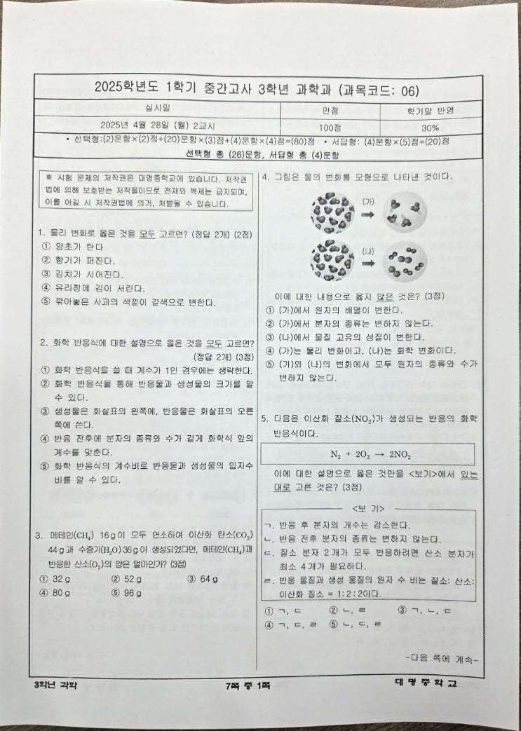 대명중은 난이도 중상정도의 문제로만 출제되었으나 수능형으로 모두 고르는 문제가 많이 출제되어서 수능형 문제와 난이도 상 문제를 많이 풀어보고 정리해 두어서 틀리지 않게 반복해야 한다 서술형도 서브 문항이 있어서 시간 안배도 중요하겠다 <img src="https://blogthumb.pstatic.net/MjAyNjA0MTlfMjM3/MDAxNzc2NTcxOTY5MDU2.OXh7nm8I0QaUNQX1yOa2OnDkQMTU_Rjqaedz-IyOc7Ag.pvgD3hiuITFexigBiRGmxjcjTX17-o6qK9d1qBWH4bMg.JPEG/900_20260419_131135.jpg?type=s3" />