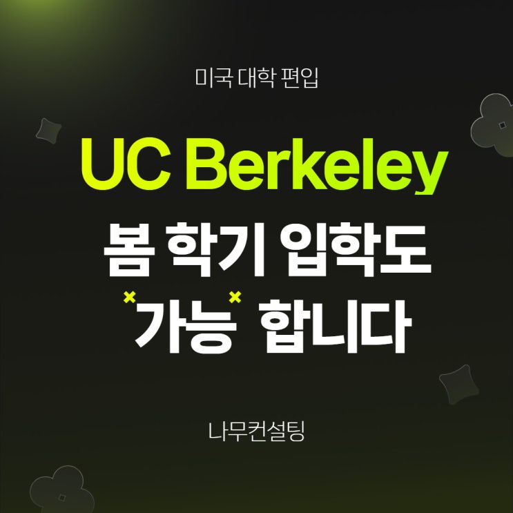가을학기 지원 후 Spring 오퍼를 받은 실제 케이스 분석 안녕하세요. 미국 명문 대학 편입/입시 컨설팅 전문 나무컨설팅입니다. 이번엔 흥미로운 합격 케이스를 소개하려 합니다. 가을학기에 지원했지만 봄 학기 오퍼를 받은 나무컨설팅 학생의 케이스입니다. 많은 편입 지원자분들이 가을학기에 편입 지원을 합니다. School year의 시작이기도 하고 학교의 적응하는 것에 있어 장점이 있기 때문인데요. 몇몇 학교들도 가을학기에만 편입 지원을 받습니다. UC Berkeley 또한 그 학교들 중 하나입니다. 그럼 이런 합격 케이스는 어떤 의미일까요? 가을학기로 지원했지만 봄 학기 오퍼를 받는 것은 충분히 정상적인 합격 결과이며, 의미 있는 기회....... <img src="https://blogthumb.pstatic.net/MjAyNjA0MjBfMjI5/MDAxNzc2NjQ4MDA0ODIw.DISk39-Ldzk42E42FrLD1bl2HnXyZTAGA4Hj_1p9WNEg.uRN3UPO1H-wABfg6fwf-M7LN6FltDwWaC54kYzFZ1Wgg.JPEG/%C1%A6%B8%F1%C0%BB_%C0%D4%B7%C2%C7%CF%BC%BC%BF%E4_%287%29.jpg?type=s3" />