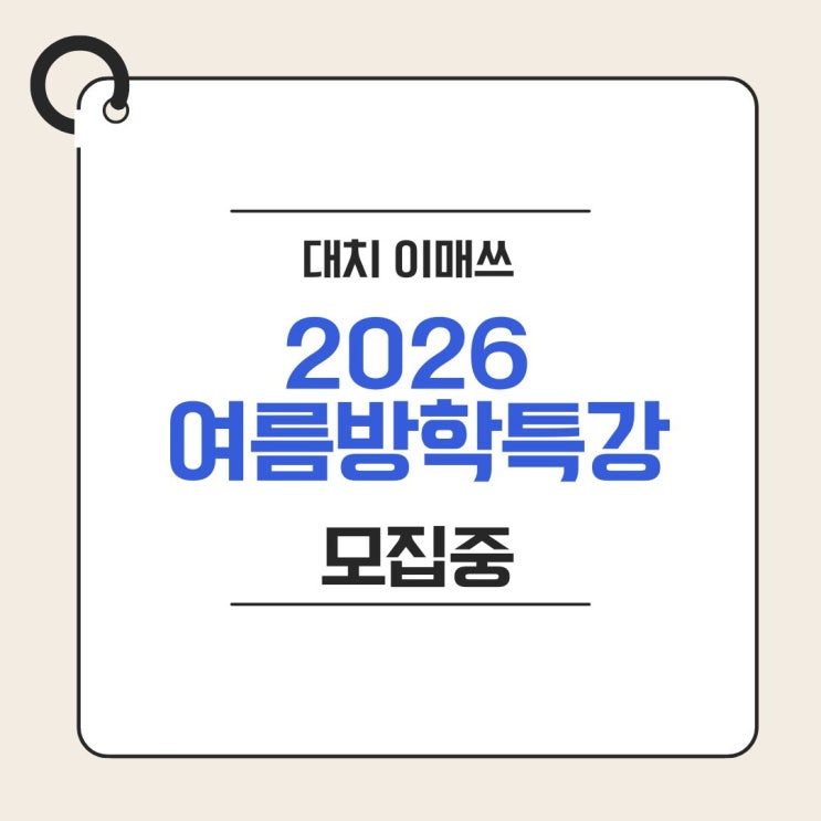 안녕하세요. 국제학교 입학 및 수학 전문 대치 이매쓰입니다. 다가오는 여름방학, 학생의 실력을 한 단계 끌어올릴 수 있는 가장 중요한 시기입니다. 이매쓰에서는 국제학교 학생들을 위한 2026 여름방학 수학 특강을 진행합니다. 프로그램 핵심 특징 이매쓰 여름방학 수학 특강은 다음 3가지를 중심으로 운영됩니다. 수준별 맞춤 수업 사고력 중심 수학 학습 내신 및 입시 대비 완성 단순한 문제풀이가 아니라 학생별 방향을 설정하고 실질적인 성과로 연결하는 것이 목표입니다. 수업 시작 일정 개강일: 5월 25일 시작 (개강 이후 수시 등록 가능) 주요 프로그램 세부 시간표 Grade-Level Math Courses Advanced Math Track Advanced &amp....... <img src="https://blogthumb.pstatic.net/MjAyNjA0MjhfMjkw/MDAxNzc3MzM3ODc4ODc2.LCi9psUdlJIwJz5wLpgoFwhrokQaeM8C3ehTtiFpWwAg.-X8B515a72nk6NmaFSOj8e7nuQnEZtbxe-IJHN95eGQg.JPEG/12.jpg?type=s3" />