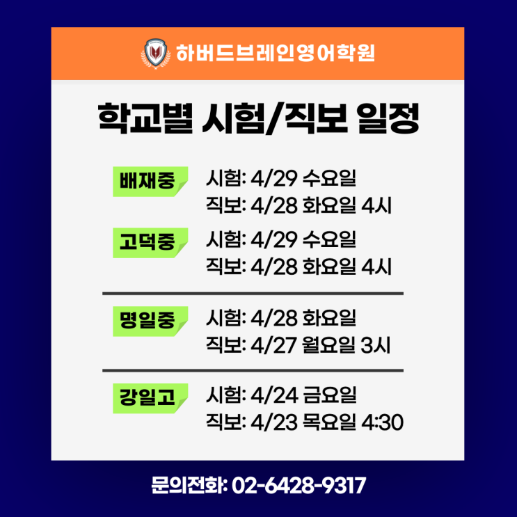 안녕하세요. 고덕동 중등전문 영어학원 하버드브레인 에리카 원장입니다. 중고등 영어 시험을 앞두고 가장 중요한 것은 직전 보강입니다. 단순한 문제풀이가 아니라, 시험 직전에 반드시 점수를 끌어올리는 핵심 포인트를 정리하는 시간이기 때문입니다. 직보 일정 안내 이번 중간고사 대비 직보 일정 안내드립니다. 배재중 시험: 4/29 (수) 직보: 4/28 (화) 오후 4시 고덕중 시험: 4/29 (수) 직보: 4/28 (화) 오후 4시 명일중 시험: 4/28 (화) 직보: 4/27 (월) 오후 3시 강일고 시험: 4/24 (금) 직보: 4/23 (목) 오후 4시 30분 하버드브레인 영어학원의 직보는 다릅니다. ✔ 학교별 기출 기반 핵심 문장 정리 ✔ 서술형 대비 완벽 대비 ✔ 시험....... <img src="https://blogthumb.pstatic.net/MjAyNjA0MjFfMjU2/MDAxNzc2NzY0NDQ3NDcw.SDJ21bba7BJCGfe-iaWWLU7wgnS7llzRdlznhjV3-rAg.dARfGNaMH0pkCFyp-lM72NyBiB7FPYQiM-jG4zU_-DEg.PNG/%B1%E2%B8%BB-%C1%F7%BA%B8%C0%CF%C1%A4_%C7%D0%BA%CE%B8%F0__%BA%B9%BB%E7%BA%BB-001.png?type=s3" />