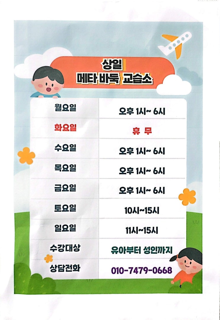 변경된 학원 시간표 입니다. 화요일이 정기 휴일 입니다. 5주차는 휴일 또는 공휴일 등이 있을때 보강하는 주입니다. 특징으로 토요일 뿐 아니라 일요일도 수업을 할 수 있도록 시간을 오픈 하였습니다. 감사합니다. <img src="https://blogthumb.pstatic.net/MjAyNjA0MjBfNDcg/MDAxNzc2NjY3MTczNzg4.1Zm_lkh9oLFc_mAvFu_7QqhKX3Fib_dSU9PxglNImAkg.vPR_pqnu3_JD0_POUsEQSykPYnhPfEb5XzezHwPIZWIg.JPEG/KakaoTalk_20260420_153832431.jpg?type=s3" />