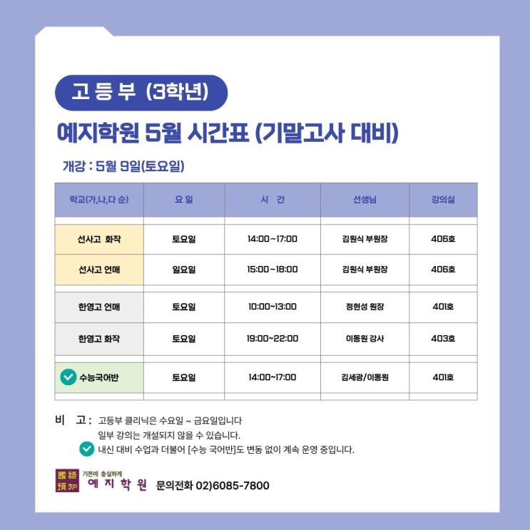 (고등 3학년) 예지학원 5월 내신대비 시간표 안내(개강: 5월 9일)/강동구 국어 학원 추천