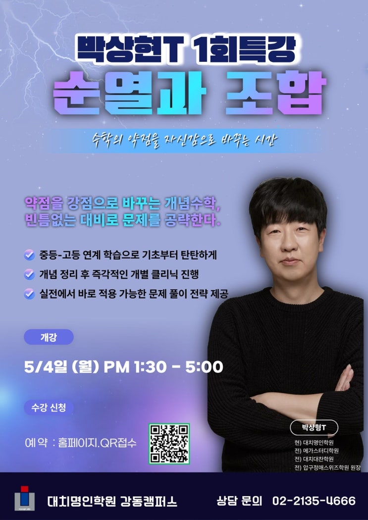 안녕하세요, 대치명인학원 강동캠퍼스입니다. 많은 학생이 수학에서 유독 어려워하고 실수가 잦은 단원, 바로 [순열과 조합]입니다. 개념은 알 것 같은데 막상 문제를 풀면 어떻게 적용해야 할지 막막했던 경험, 한 번쯤은 있으시죠? 수학의 약점을 자신감으로 바꾸는 시간! 검증된 실력파, 박상현 선생님의 명쾌한 1회 완성 특강을 준비했습니다. ✨ 박상현T 순열과 조합 특강 Point 1. 기초부터 탄탄한 연계 학습 중등 과정부터 고등 과정까지 이어지는 핵심 개념을 연결하여, 흔들리지 않는 기본기를 완성합니다. 2. 즉각적인 개별 클리닉 개념 정리만 하고 끝나는 강의가 아닙니다. 수업 후 즉시 진행되는 개별 클리닉을 통해 본인의 취약점....... <img src="https://blogthumb.pstatic.net/MjAyNjA0MjBfMTMx/MDAxNzc2NjgyNjA5MTc2.CwZZOvB4RpLDjjs2RZ1v26aFG2W0XcPYneivMiAE13cg.6L6v5KJh5rffxaJrEfmXb9yHH710I9vMGxnvRucVc4Mg.JPEG/%BC%F8%BF%AD%B0%FA%C1%B6%C7%D5%C6%AF%B0%AD1100.jpg?type=s3" />