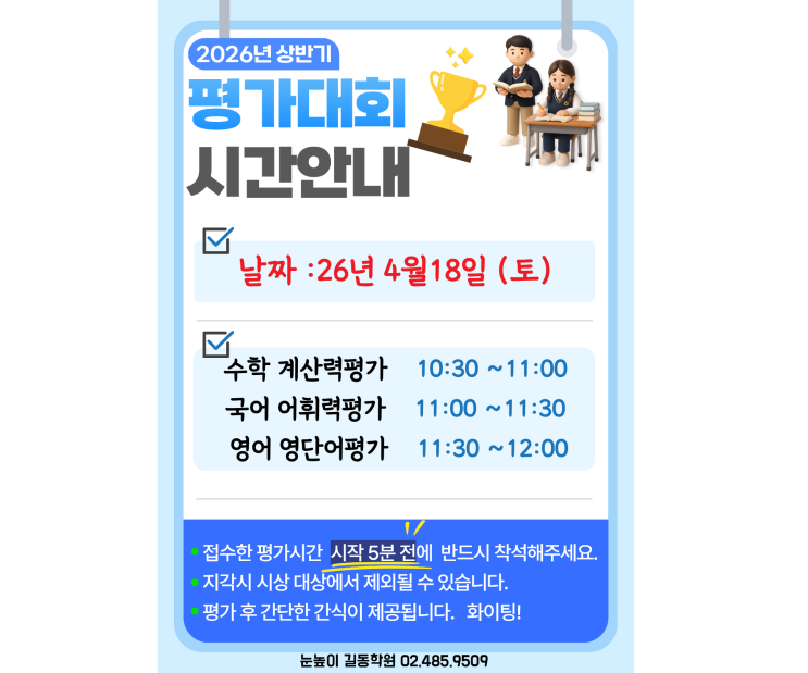 안녕하세요 눈높이 길동학원입니다~! 오늘은 지난 주 토요일(4/18)에 있었던 제 21회 눈높이 길동학원 계산력,영단어,어휘력 평가대회에 후기를 올려보려고 합니다~~ 따뜻한 봄 기운을 만끽하며 한 달 동안 열심히 연습한 실력을 뽐내기 위해 우리 길동 친구들이 센터에 모였습니다. 각자 최선을 다해 시험에 응시해 준 길동 친구들과 한달동안 평가 대비 및 시험 감독까지 책임져 주신 선생님들 정말 고생하셨습니다~~ 우리 친구들이 열심히 노력하고 고생한 만큼의 결실을 분명 맺을 수 있을거라 믿고있어요~!! 앞으로도 지금처럼 즐겁고 신나게 꾸준히 함께 공부해요~!! 눈높이 길동학원 친구들 화이팅~~!!!!! <img src="https://blogthumb.pstatic.net/MjAyNjA0MjBfMjEw/MDAxNzc2NjcwODU5OTgz.fXV1ktQa2Fs9TljPHyu57-Wbjr4G1YqlDDriPu2SFvog._R7ElrR2ewO0o4GnoVDeXlbIHPd1iWH1DD0xJPxU-QAg.PNG/image.png?type=s3" />