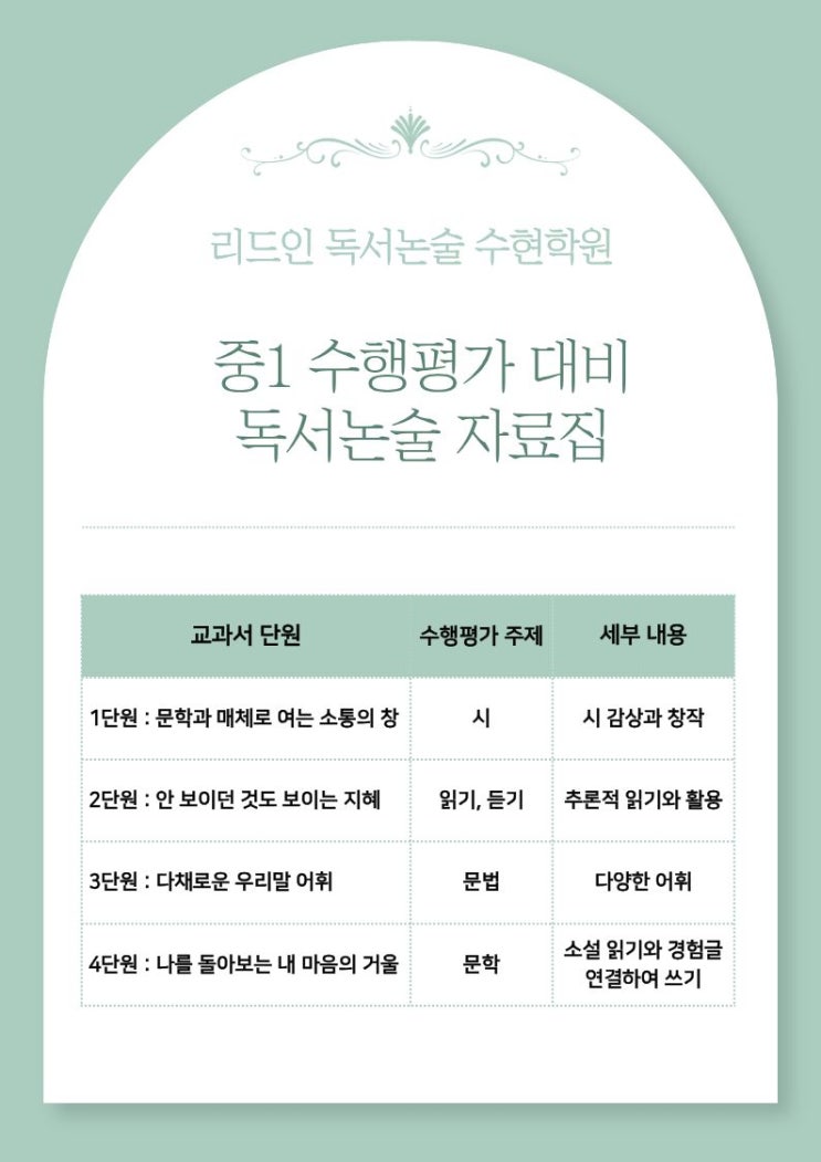 안녕하세요! 리드인 봉담 수현학원입니다. 중1 국어 수행평가, 미리 준비하면 어렵지 않습니다. 수현중/화담중/봉담중/동화중 1학년 수행평가 대비 모습을 공개합니다. 1단원 : 문학과 매체로 여는 소통의 창 시 감상과 창작 중학교에 입학한 1학년 학생들이 가장 낯설어하는 평가 중 하나가 바로 국어 수행평가입니다. 특히 시험처럼 정답만 고르는 것이 아니라, 직접 생각하고 표현해야 하는 <시 창작 수행평가>는 아이들에게 더 큰 부담으로 다가옵니다. 리드인 수현학원에서는 수현중/화담중/봉담중/동화중 1학년 학생들이 학교에서 실시하는 수행평가를 어려움 없이 준비할 수 있도록 교과서 단원별 수행평가 리스트를 미리 파악하고....... <img src="https://blogthumb.pstatic.net/MjAyNjA0MDhfNDEg/MDAxNzc1NjExNTE2MDQx.dfdtodAkjMduXfr46SrzfL6iuJ-4rU5eoNVgpP81T6Eg.NAM80AnJGDUeIJI1AfkxEZWrZfCYLc2UukZI1APihBYg.JPEG/%C1%DF1%BC%F6%C7%E0%C6%F2%B0%A1_%B4%DC%BF%F8%BA%B0%B8%AE%BD%BA%C6%AE_%C7%A5%C1%F6%28%BC%F6%C1%A4%BA%BB%29.jpg?type=s3" />