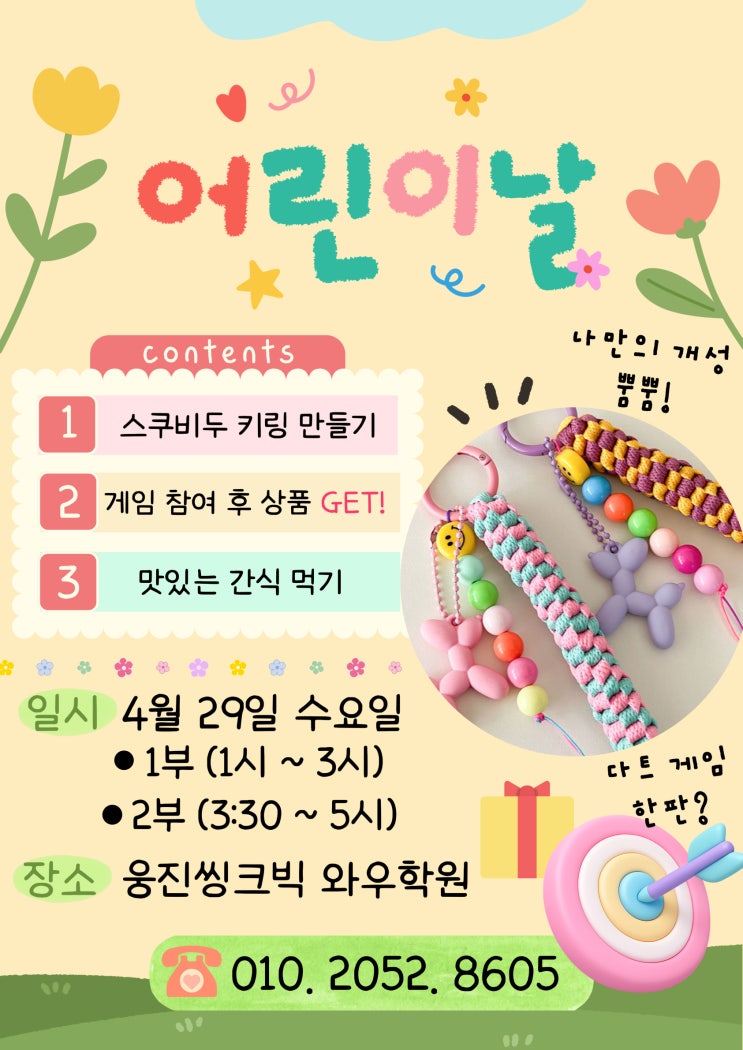 5월 5일은 푸르른 새싹 같은 우리 어린이들의 날입니다 와우학원에서도 어린이날 행사를 준비했어요! 일시 : 4월 29일 수요일 장소 : 웅진씽크빅 와우학원 (롯데슈퍼 2층) 시간: 1부 (1시 ~ 3시) 2부 (3:30 ~ 5시) 행사 프로그램 01. 스쿠비두 키링 만들기 02. 다트 게임 & 컬링 게임하고 상품 GET ! 03. 맛있는 떡볶이 먹기 새로 참여할 친구 모집합니다! 문의 010. 2052. 8605 <img src="https://blogthumb.pstatic.net/MjAyNjA0MTRfMTQw/MDAxNzc2MTU0OTk3Mzk5.K1FS7uIMlN35EMXnNIpCOmTCTSh1Jkfl862OlK83oyAg.6BdKF0Xa8h7zOH7AJzlHlU4jmu_4EhdvQrBmRSofpm8g.JPEG/%C1%A6%B8%F1%BE%F8%C0%BD_%282%29.jpg?type=s3" />
