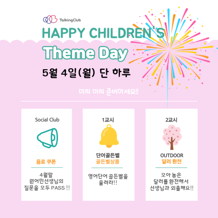 처음부터 토킹클럽! 안녕하세요~ 토킹클럽입니다!! 5월 5일은 즐거운 어린이날입니다! 토킹클럽에서는 어린이날을 기념하여 5/4(월) 에 어린이날 Theme Day 가 예정되어 있습니다~! 어린이날 Theme Day에 어떤 재미있는 행사가 준비되어있는지 확인해볼까요? 우선 Speaking Class 에서의 Theme Day입니다!! 4월 Speaking Class에서 배운 표현을 익혀서 원어민 선생님의 테스트를 통과하세요!! 우수한 성적을 낸 친구들을 위해 " 음료 쿠폰 " 이 준비되어 있습니다! 우리 학생들 모두 열심히 공부해서 좋은 성적을 획득하길 바라요~ 어린이날 Theme Day 의 1교시는 " 도전 골든벨 " 입니다~ 평소에 공부한 영어 단어를 뽐내고....... <img src="https://blogthumb.pstatic.net/MjAyNjA0MDhfNTkg/MDAxNzc1NjM2MjkwMTIy.BcZzbWinR5_SEwcmf0K3J0Z9foMgbRaTldn34SPNBVAg.1aegJyx_h9nI0W9F0hWc1QWDEBWNTubuFuSFQqcXpC0g.PNG/%BD%BD%B6%F3%C0%CC%B5%E51.PNG?type=s3" />