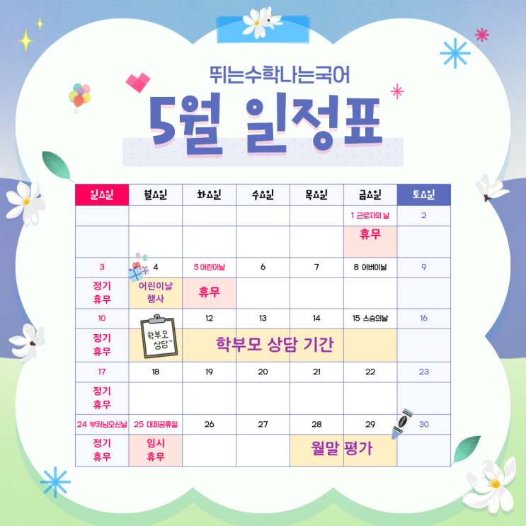 [병점동]뛰는수학나는국어 시험 후 흐트러질까 걱정되시죠? 5월 학사일정 미리 안내드립니다