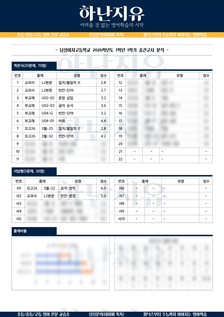 [남성여고] 2026년 1학년 1학기 중간고사 분석 - 동삼동 영어 교습소, 하난지유영어