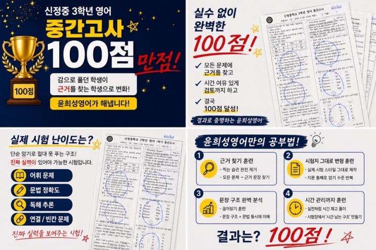 정관 신정중3 영어 100점 실화 중간고사 만점 만든 공부법 공개합니다 신정중 3학년 영어 중간고사 100점 “감으로 풀던 학생 → 근거 찾는 학생으로 변화” “진짜 결과가 나왔습니다.” 이번 금요일, 신정중학교 3학년 영어 중간고사 우리 학원 학생 100점 만점 달성 단순한 고득점이 아니라 실수 없이 완벽한 만점입니다. ❗ 그런데 더 중요한 건 따로 있습니다 이 학생은 원래 ✔ 해석만 하고 ✔ 문제는 감으로 풀고 ✔ 시간이 부족했던 학생이었습니다 하지만 시험에서는 모든 문제에 근거를 찾고 시간 여유 있게 검토까지 하고 결국 만점 실제 시험 난이도는? 첨부된 시험지 보시면 아....... <img src="https://blogthumb.pstatic.net/MjAyNjA0MjZfMTI3/MDAxNzc3MjA4NzQwMjEy.qi7vT7BgSyAyQZTvWPU5eCelOwYewwUzLuELYSd4kPsg.UdlVCwfd7nwiU-2EST7XjYtLzd3K3KRKTmQLgffWvZIg.JPEG/6173B5B2%A3%ADAB92%A3%AD4CA4%A3%AD9C92%A3%ADF1F2653B5B86.jpg?type=s3" />