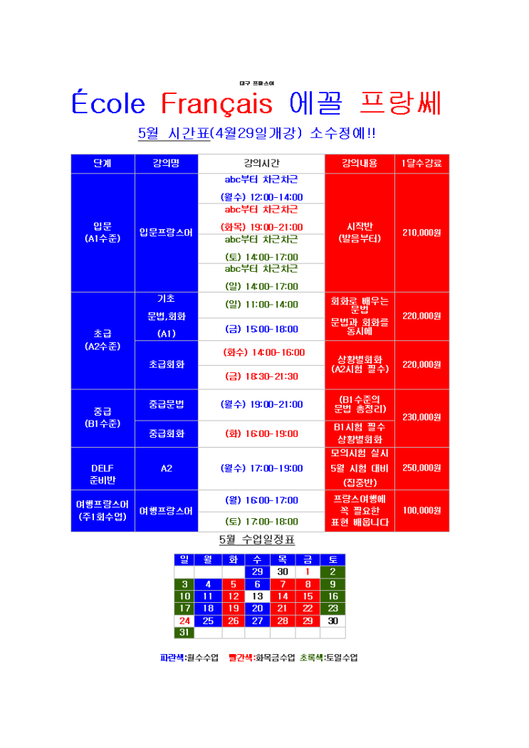 대구 프랑스어(불어) 전문학원 '에꼴프랑쎄프랑스어교습소' 2026년 5월 수업시간표