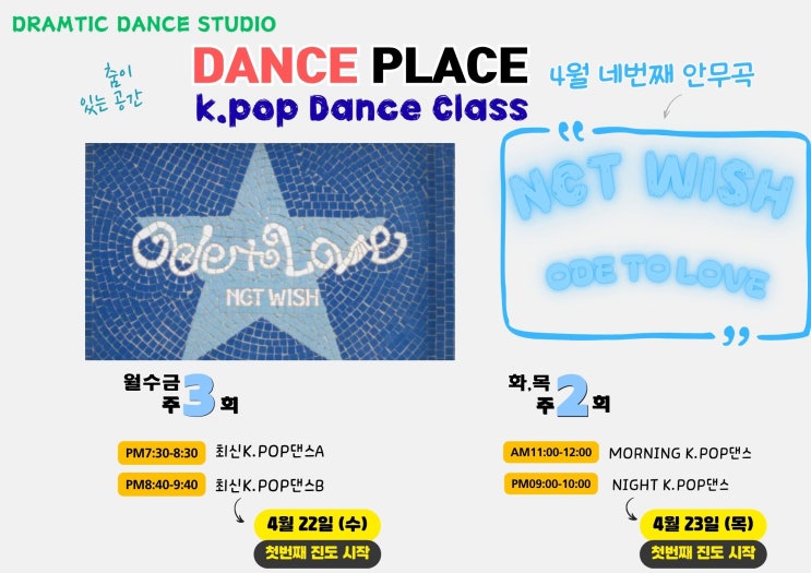 2026년 4월 안무 안내 4월 마지막 안무곡 안내 NCT WISH 'Ode to Love' 대구칠곡댄스학원 댄스플레이스 · 성인 방송댄스 취미반 안녕하세요 대구 북구 칠곡3지구 댄스학원 댄스플레이스 입니다:) 벌써 4월의 마지막 안무곡을 안내드리는 시점이 되었네요. 매달 느끼는 거지만, 한 달이 정말 빠르게 지나가는 것 같습니다. 이번 달 마지막 안무곡 4월 네 번째 · 마지막 안무 NCT WISH- Ode to Love 남자그룹 안무 한곡 진행 합니다:) 사실 이번 곡 선정 과정에서 Sticky와 정말 많이 고민했어요 조금 더 트렌디하고 리듬감 있는 Sticky도 매력적이었지만, 타이틀곡이라는 상징성과 난이도, 수업 완성도를 고려해서 Ode to....... <img src="https://blogthumb.pstatic.net/MjAyNjA0MTlfMTEy/MDAxNzc2NTgyOTc5MTQx.sj92wUoUtTaKXJ-tGgAnxJI-4zI8WimQkC2RfFs-iUUg.uqjDLv0jtalueU-Mt2KS96y4AO9uhTbDy0KMiAPA-sEg.JPEG/DANCE_PLACE_%2811%29.jpg?type=s3" />