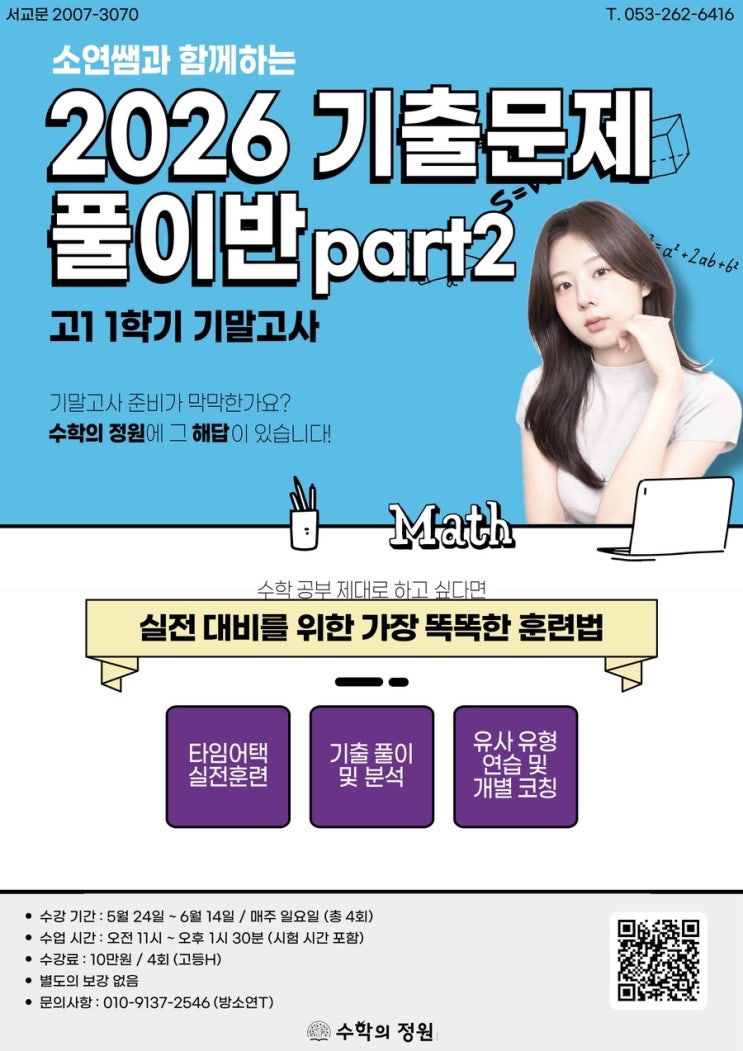 안녕하세요 칠곡대영학원의 꼼꼼한 배쌤입니다 4월 말,중학생들의 1학기 중간고사가 다가오면서 학습에 대한 긴장감도 점점높아지고 있습니다. 저희 대영학원에서는 이러한 중요한 시기를 더욱 체계적으로 준비할 수 있도록 시험 2주 전부터 토요일과 일요일 주말 특강을 운영하고 있습니다 주말까지 학원에서 함께 공부한다는 것은 단순한 보충 수업의 의미를 넘어 아이들이 끝까지 흐트러지지 않고 학습 리듬을 유지할 수 있도록 위함입니다. 혼자 공부하다 보면 방향을 잃거나 어려운 부분에서 쉽게 지칠 수 있지만 주말 특강을 통해 선생님과함께 문제를 해결하고 친구들과 같은 목표를 공유하며 더욱 집중할 수 있는 환경을 제공합니다. 특....... <img src="https://blogthumb.pstatic.net/MjAyNjA0MThfMTQz/MDAxNzc2NDg2ODg2Nzcy._OhRJDi5bzA-HDNtmBJMFoEYSCLGFkGgPN3yu_6NUTIg.XMMgLlxuAjw_Z3f_ttlWsLNdG1XsizGtgmbq3NUwIDgg.JPEG/900_20260418_131809.jpg?type=s3" />