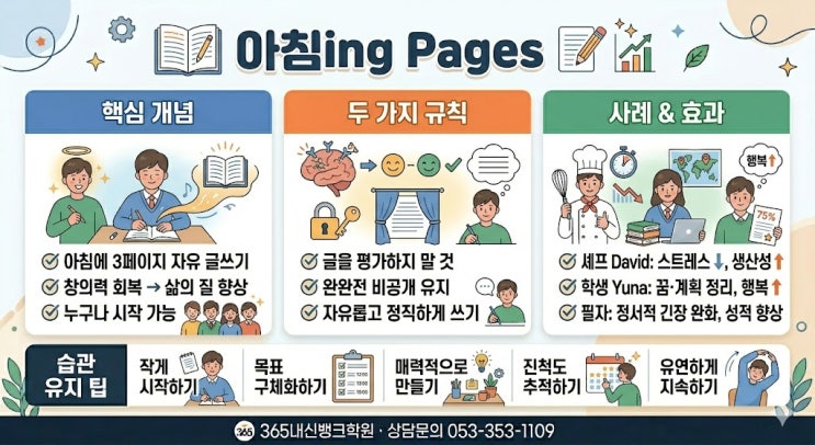 #교육정보 #내신대비 #고1영어 #자기계발 #공부습관 #365내신뱅크학원 안녕하세요, 365내신뱅크학원입니다 오늘은 고등학교 1학년 영어 교과서 YBM(박준언) 1과 Enrich Your Life의 핵심 본문인 'The Magic of Morning Pages'를 완벽하게 분석해 드립니다. 한글 번역 뒤에 주요 영어 표현을 배치한 학원 전용 포맷으로 학습 효율을 극대화해 보세요! 1. 아침 저널링의 마법 (The Magic of Morning Pages) 내 채널 'Good Habits'에 오신 것을 환영합니다! (Welcome to my channel Good Habits!) 나는 여러분의 팟캐스트 호스트인 Regan입니다. (This is Regan, your podcast host.) 오늘 나는 나를 포함한....... <img src="https://blogthumb.pstatic.net/MjAyNjA0MjRfNDYg/MDAxNzc3MDEwNjMzNjQx.5KAo3oVQHzBmXIW2dPCmwomfec-PHD2dbkYnp5jbqTAg.60MmevCduyoQNSm4t6QNMUMg14bZfqkcBzodqUvkXQMg.JPEG/%B9%DA%C1%D8%BE%EE1.jpg?type=s3" />