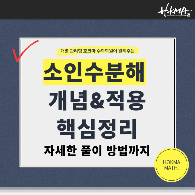 안녕하세요. 산곡동 수학학원, 호크마수학학원입니다. 중1 수학을 시작하면 가장 먼저 등장하는 중요한 단원이 바로 소인수분해입니다. 처음 배우는 학생들은 소수, 합성수, 인수 같은 낯선 용어 때문에 "이게 뭐지?" 하고 어려움을 느끼는 경우가 많습니다. 소인수분해는 숫자가 어떻게 만들어졌는지를 이해하는 과정입니다. 그래서 오늘은 산곡동 수학학원 호크마에서 소인수분해를 처음 배우는 학생들이 꼭 알아야 할 핵심 개념과 흐름을 쉽고 명확하게 정리해 보겠습니다. 1. 왜 소인수분해를 배울까요? 중1 수학에서 소인수분해를 배우는 이유는 단순합니다. 약수와 배수를 쉽게 구하기 위해서입니다. 어떤 수의 약수를 구할 때 하....... <img src="https://blogthumb.pstatic.net/MjAyNjA0MjZfMzQg/MDAxNzc3MjEzNjAwNDcx.EhRCUEFRb3whyYXZ9v28YHxZJoB3HICr10R9x1q7L_wg.hegMYvIWtnm7TyufasYL3qz4CujZafqFGop0DTRjXnUg.PNG/001.png?type=s3" />
