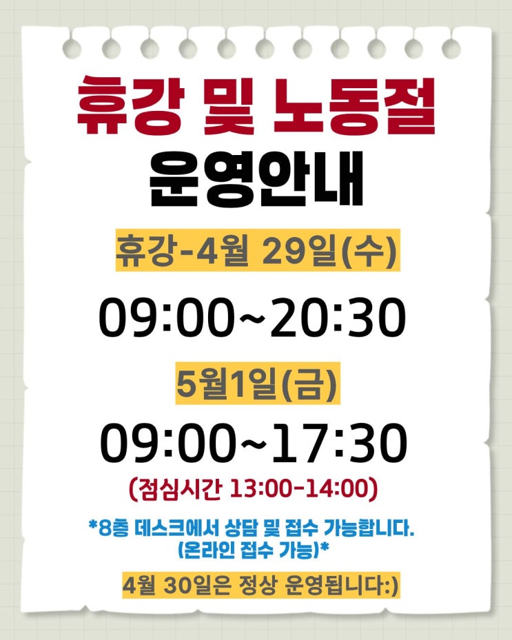 안녕하세요! YBM인천어학원 휴강 및 노동절 운영 일정 안내드립니다. 학원 방문 예정이신 분들은 꼭 확인해주세요 4월 29일 (수) 휴강 안내 ✔ 운영시간: 09:00 ~ 20:30 ※ 해당 날짜는 수업은 휴강이지만 상담 및 접수는 정상 운영됩니다. 5월 1일 (금) 노동절 운영시간 ✔ 운영시간: 09:00 ~ 17:30 (점심시간: 13:00 ~ 14:00) 노동절 당일에는 운영시간이 단축되니 방문 시 참고해주세요! ✔ 8층 데스크에서 상담 및 접수 가능 ✔ 온라인 접수도 가능 5월 개강일 안내 ✔ 월·수·금반 → 5월 4일(월) 개강 ✔ 화·목·금반 → 5월 7일(목) 개강 ✔ 주말반(토요일) → 5월 2일(토) 개강 5월 개강 일정도 미리 체크해두시면 좋....... <img src="https://blogthumb.pstatic.net/MjAyNjA0MjdfMTQ3/MDAxNzc3MjY1ODMxMzYz._2GAeRNvODmOCd1JdxdLP0uqNc9YB44IvYA03fRX5iwg.LsyTmApEjLMDVwoCig_Gi6y6WW7q27BJYVDz_rlsHrQg.JPEG/%C1%A6%B8%F1%C0%BB_%C0%D4%B7%C2%C7%D8%C1%D6%BC%BC%BF%E4..jpg?type=s3" />