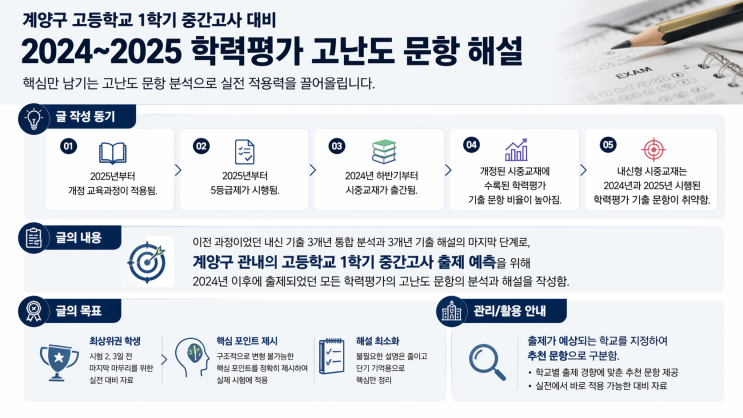 이번 글은 2025년부터 적용된 교육과정 개정과 5등급제 시행, 그리고 2024년 하반기 이후 출간된 시중 교재의 변화에 대응하기 위한 기록입니다. 5등급제로의 전환은 단순히 등급 구간이 넓어지는 변화가 아닙니다. 변별력의 무게가 이동하면서 출제 구조 자체가 달라질 수 있고, 그 변화가 가장 먼저 반영되는 시험이 바로 1학기 중간고사입니다. 최근 출간된 개정 교재들은 학력평가 기출 문항의 반영 비율이 높아지고 있는 반면, 정작 2024년과 2025년에 시행된 최신 학력평가 문항에 대한 대비는 상대적으로 취약한 구조를 보이고 있습니다. 이러한 흐름은 내신 시험에서도 동일하게 반영될 가능성이 높습니다. 본 글은 기존에 진행해 온 내....... <img src="https://blogthumb.pstatic.net/MjAyNjA0MjRfMzQg/MDAxNzc2OTU3NDQzMDM5.dCF6zyMDEMvSbNISujD3w-qR1wuLReK2bZHwPaiUa80g.r-xPiTFrp3WsSyx4b7fq9FUEcAhXAtoeiCUKIJekfXMg.PNG/%C7%D0%B7%C2%C6%F2%B0%A1_%B0%ED%B3%AD%B5%B5_%B9%AE%C7%D7_%C7%D8%BC%B3.png?type=s3" />