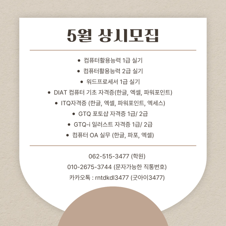 안녕하세요. 굿아이컴퓨터학원 친절한 노랑머리원장쌤 입니다. 날씨가 덥나...?싶다가 저녁되면 쌩하니 추워지는것이 감기걸리기 딱 좋은 요즈음 입니다. 생각보다 이때 상담이 많이 들어옵니다. 우선 저희 굿아이컴퓨터학원이 모집하는 과정은 아래와 같습니다. 자격증이야 당연히 커리큘럼에 맞게 차근차근 배우고 실무의 경우 기초 기능을 배운다음 상담한 내용에 맞게 중간부턴 조금씩 수강생마다 달라집니다. 저희 굿아이컴퓨터학원의 추천 이유는 ✔ 초보자 맞춤 1:1 상담 ✔ 실무 중심 커리큘럼 ✔ 단체수업이 아닌 개별로 진행되는 수업 ✔ 수강생 만족도 높은 강의 이런 분들께 추천합니다 ✔ 취직 바로 2주전 어떡하지?! ✔ 이직 준비....... <img src="https://blogthumb.pstatic.net/MjAyNjA0MjdfOTEg/MDAxNzc3Mjc4NjA4MjQ3.0PcLpy2m3eoRLcGmbBUx_y26JTzxjCn3uUI4gQvwRA4g.uC-HUKQg9pUxSn_9ZAday5V5NqxDlgj4f2UaMiqwD0Mg.PNG/%C1%A6%B8%F1%C0%BB_%C0%D4%B7%C2%C7%D8%C1%D6%BC%BC%BF%E4._%2814%29.png?type=s3" />