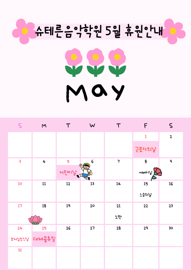 안녕하세요, 슈테른음악학원입니다. 따뜻한 5월을 맞아 학원 휴원 일정 안내드립니다. 5월 휴원일 5월 1일 (금) 근로자의 날 5월 5일 (화) 어린이날 5월 25일 (월) 대체공휴일 해당 날짜에는 수업이 진행되지 않습니다. ✔️ 보강 안내 주 2회, 주 3회 수업 학생 중 휴원일과 수업이 겹치는 경우에는 별도로 보강 수업을 진행할 예정입니다. 보강 일정은 아이들 수업 스케줄을 고려하여 조율해드릴 예정입니다. 아이들이 수업 흐름이 끊기지 않도록 꼼꼼하게 챙겨서 보강 진행하겠습니다 가정에서도 즐거운 5월 보내시고, 항상 믿고 맡겨주셔서 감사합니다 슈테른음악학원 드림 <img src="https://blogthumb.pstatic.net/MjAyNjA0MjhfMTk3/MDAxNzc3MzQ0NTQwNjY1.k0YtcZt3W5iVRNw11uAQ-Oj_LsXEpMwcbVsWQWFAG4wg.Jz9aOMVaPiHY_b-OAXzWr93HydDROpzCnuqBKkSPVfYg.PNG/5%BF%F9_%C8%DE%BF%F8%BE%C8%B3%BB_2026.png?type=s3" />