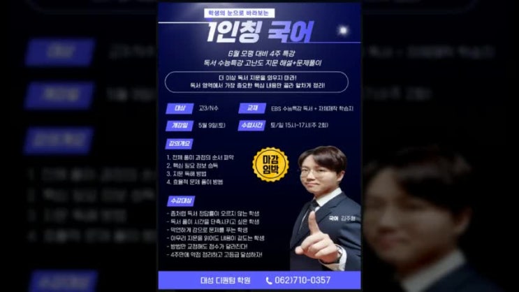 수완지구 국어학원 명가 대성 디퀀텀학원에서 국어 6월 모평을 대비한 4주 특강을 2026년 5월 9일 토요일에 개강하게 되어, 이번 포스트에서는 이와 관련해서 안내를 드리도록 할게요...^^ 학생의 눈으로 바라보는 1인칭 국어 김주형 T 6월 모평 대비 4주 특강 독서 수능특강 고난도 지문 해설과 문제풀이 더 이상 독서 지문을 외우지 마라! 독서 영역에서 가장 중요한 핵심 내용만 골라 알차게 정리! 01. 개강일 : 2026년 5월 9일 토요일 02. 수업 기간 : 2026년 5월 9일 토요일 ~ 5월 31일 일요일 03. 수업 시간 : 매주 토요일, 일요일 오후 3시부터 오후 5시까지 04. 교재 : EBS 수능특강 독서 + 자체 제작 학습지 05. 강의 개요 1) 전체 풀이....... <img src="https://phinf.pstatic.net/image.nmv/blog_2026_04_28_3129/tMC86sQAFW_01.jpg?type=f480x480" />