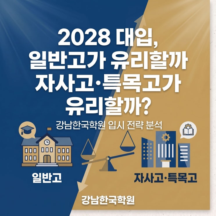 안녕하세요. 강남한국학원입니다. 2028 대입 체제를 앞두고 고교 선택을 바라보는 시각도 달라지고 있습니다. 이제는 "일반고가 유리한가, 자사고·특목고가 유리한가"라는 이분법적 질문만으로는 충분하지 않습니다. 더 본질적인 질문은 따로 있습니다. 우리 아이는 어떤 학교에서, 어떤 방식으로 자신의 강점을 더 잘 증명할 수 있는가. 학교 차이는 사라지지 않는다, 오히려 선명해진다 내신 5등급제와 고교학점제가 도입되면 학교 간 차이가 사라질 것이라는 시각도 있습니다. 하지만 저는 오히려 반대로 봅니다. 차이가 사라지는 것이 아니라, 어떤 학생이 어느 체제에서 더 경쟁력을 가질지가 더 선명해질 가능성이 크다고 봅니다....... <img src="https://blogthumb.pstatic.net/MjAyNjA0MjFfOTcg/MDAxNzc2NzczNjk1NDg1.zuuW1L23QvdzLiKnOn1z2gkY7Ls2CO6R3Wwvg806RvIg.zwKqyy8tqbPUwozoxgJDEG18-e1kpCCZPXC93ctbD-0g.JPEG/AIDrawing_260421_e71f69b8-5c87-43d8-afbe-988ac1feee1c_0_MiriCanvas.jpg?type=s3" />
