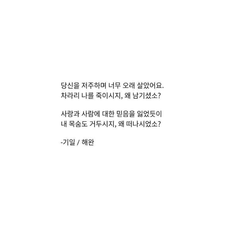 당신을 저주하며 너무 오래 살았어요. 차라리 나를 죽이시지, 왜 남기셨소? 사랑과 사람에 대한 믿음을 잃었듯이 내 목숨도 거두시지, 왜 떠나시었소? -기일 / 해완 <img src="https://blogthumb.pstatic.net/MjAyNjA0MThfNTYg/MDAxNzc2NDQ5ODYxOTI1.tPUlvw_fLXLN6u3ZNJ3gqG2DGZuxYnOfwbSbW7SzCLkg.8JaCbxnrFJ6Vo-OhlmTocTD5AgVFeR2rQgVk_kPlLt0g.JPEG/900%A3%DF20260418031720.jpg?type=s3" />