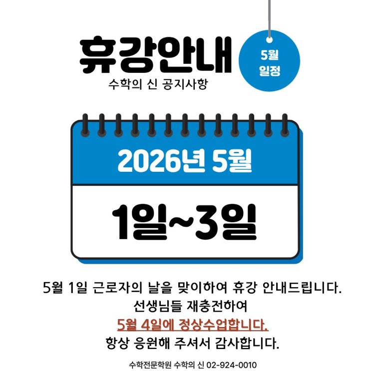 안녕하세요! 성북구 수학전문학원 수학의 신입니다. 5월 1일 근로자의 날을 맞이하여 수학의 신 선생님들 재충전 시간을 갖고자 합니다. 5월 1일(금요일) / 5월 2일 (토요일) / 5월 3일(일요일) 휴강이며, 5월 4일 월요일 정상수입니다. 참고바랍니다. 감사합니다. <img src="https://blogthumb.pstatic.net/MjAyNjA0MjBfMTUg/MDAxNzc2NjUzODAzNzkx.h9hQBNmpxHrQFScwRsUU41MmUmAwwNnUbjy5VkdQvBgg.kO1TT9NOvYeb4HpYmNS1FYTsu6U6wuA96NTGs_FqEVkg.JPEG/%C1%A6%B8%F1%C0%BB_%C0%D4%B7%C2%C7%D8%C1%D6%BC%BC%BF%E4..jpg?type=s3" />
