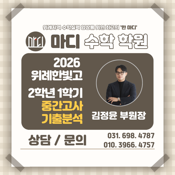 안녕하세요, 마디수학학원입니다. 오늘(2026년 4월 24일) 시행된 위례 한빛고 2학년 수학 중간고사를 바탕으로, 이번 시험이 어떤 방향으로 출제되었는지와 앞으로 내신을 어떻게 준비해야 하는지 정리해보려고 합니다. 실제 시험을 보고 온 학생들의 반응과 문제지를 함께 분석하여, 보다 현실적인 기준에서 도움드릴 수 있도록 설명드리겠습니다. 위례한빛고 2학년 기출은 김정윤 부원장님께서 분석해주셨습니다 :) [출제범위] : 지수 ~ 삼각함수 [주요문항 분석] 15번 16번 서술형 4번 [총평] 이번 위례한빛고 2학년 시험은 전반적으로 부교재 중심 출제 경향이 매우 뚜렷하게 나타난 시험입니다. 초반과 중반 문항들은 기본 개념과 유형을 정....... <img src="https://blogthumb.pstatic.net/MjAyNjA0MjRfMTc2/MDAxNzc3MDI4OTQ5ODcz.WTgFNUr7anyLtaldI8Mv5ckXAlEaUC1E7FQJiGF0sZMg.nwl4cfViopJ8QhUifeAhwnA6oR9rR9okOY8VwXUj5t4g.PNG/%C0%A7%B7%CA_%B1%E2%C3%E2%BA%D0%BC%AE_%BD%E6%B3%D7%C0%CF.png?type=s3" />