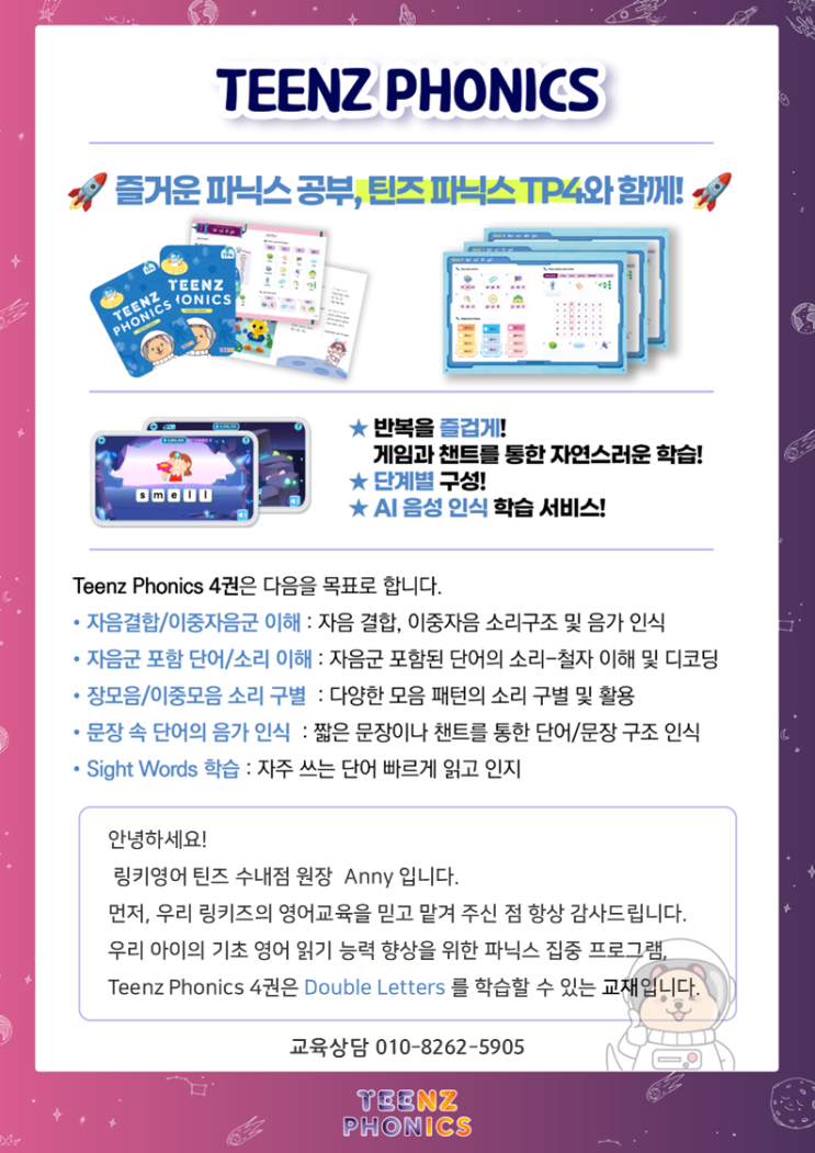 안녕하세요? 분당유치원영어 링키영어 틴즈 수내점입니다. 곡우에 비가 오면 풍년이 든다고 하는데요, 요즘 들어 봄비도 종종 내려서 촉촉하고 상큼한 봄내음이 좋아요^^ 분당 링키영어 틴즈 수내점의 5월 교재 안내합니다. 링키영어 커리큘럼은 Stage1,2,3 기본 라인외에도 Juice, Jelly의 보강 라인, 초등학년을 대상으로 하는 TEENZ까지 5세~13세까지의 유치원, 초등영어 전과정을 갖추고 있습니다. 10세~13세 초등학생을 대상으로 ESL가상 어학연수 프로그램 "TEENZ 틴즈"의 5월 교재 T3R입니다. 링키 틴즈는 실제 어학연수와 같은 환경을 제공하고, 효율적인 학습시간으로 운영되어 아이들이 청크(chunk)학습을 기반으로 꾸준히 발....... <img src="https://blogthumb.pstatic.net/MjAyNjA0MTVfMTUg/MDAxNzc2MjE4NjUxNDU1.9Xe9IYkg1NLy8z7n_BROxcduSNWQ9rkwxRft9t6yL9og.dE8EWBfzSM0YwOB3nRhQzNktwpeEpjeoY4OjEzh7mCwg.PNG/TP4_%BE%C8%B3%BB%B9%AE.png?type=s3" />