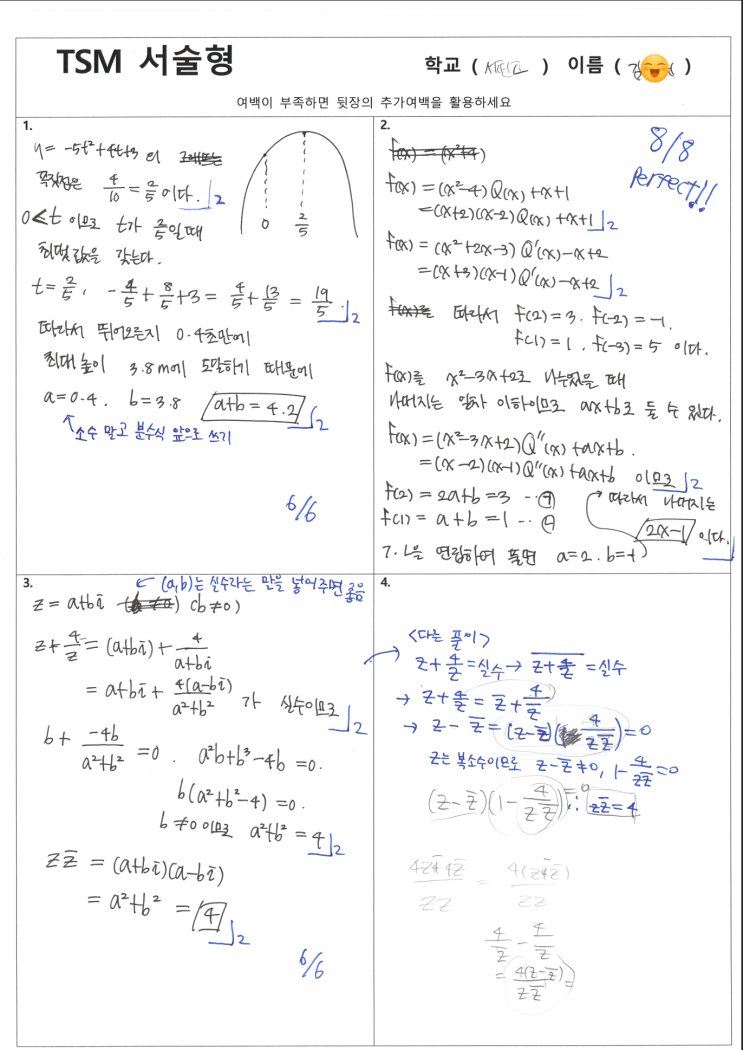 안녕하세요, TSM수학학원입니다. 시험기간을 앞두고 죽전고등학교 · 한솔고등학교 · 서현고 등 내신 시험에서 공통으로 출제되는서술형 문항을 첨삭지도 했습니다. 수학 서술형, 왜 점수가 갈릴까? 수학 시험에서 많은 학생들이 실수하는 영역이 바로 서술형 문항입니다. 대부분의 시험에서 서술형은 마지막 3문제로 구성되며, 한 문제당 8점~10점의 높은 배점을 차지합니다. 즉, 서술형 3문제만 제대로 풀어도 총 24~30점이 결정됩니다. 반대로, 여기서 무너지면 등급이 한 단계 이상 떨어질 수 있습니다. ❗ 서술형에서 점수를 잃는 대표적인 이유 1️⃣ 불필요하게 길게 쓰는 경우 부분 점수를 놓치지 않기 위해 모든 과정을 장....... <img src="https://blogthumb.pstatic.net/MjAyNjA0MjFfMTE4/MDAxNzc2NzUyMTM5ODU1.nKHTv8n1_fkTk2fWgtr5pw5wwkJ_8bxaImu8K9TOejsg.OlY3elz_Y1JdWfDpIDPrNR5Zsfg8V7scMXNfhl4BctQg.PNG/%BC%AD%BC%FA%C7%FC_%BF%B9%B8%B0.png?type=s3" />