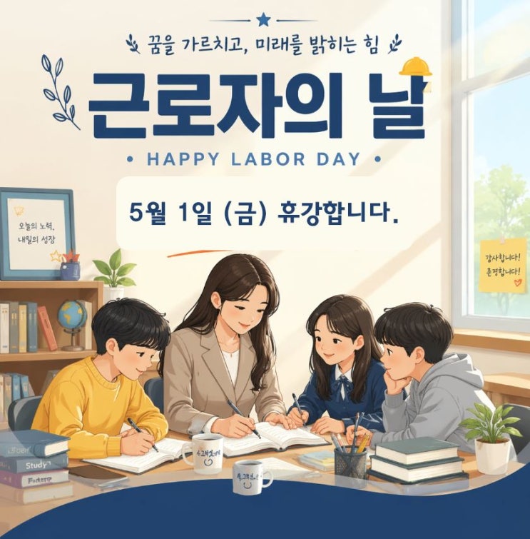 5월 1일 (금)는 법정공휴일로 휴강입니다. 휴강하여 궁금한 점 있으시면 언제든지 학원으로 연락부탁드리겠습니다. 감사합니다 <img src="https://blogthumb.pstatic.net/MjAyNjA0MDhfMTM5/MDAxNzc1NjQ2NjMwNTU4.AkztbZhb5dpjV8L5kilgVbUzm4z7J-s2bOhKdid1NAMg.worfYc3dNcXd7oOrbqGkVlg70jK2hhKcGpOqNY4SN08g.JPEG/1.JPG?type=s3" />