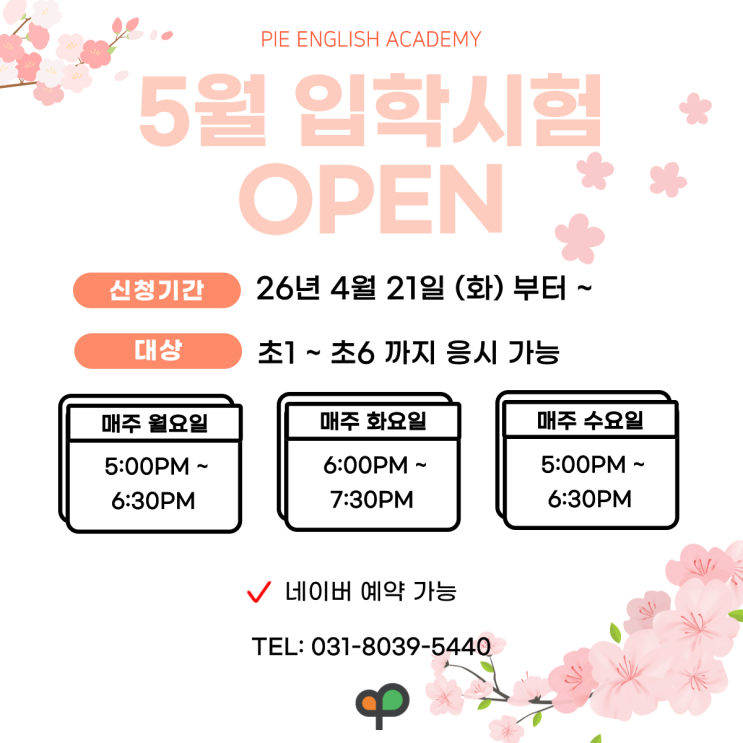 안녕하세요. PIE어학원 입니다. 2026년 5월 입학시험 신청 안내드립니다. ★초1 ~ 초6 학년 까지 신청 가능합니다★ 5월 입학시험 OPEN 5월 입학시험 신청은 26년 4월 21일 화요일 부터 신청이 가능합니다. ※ 인원이 제한되어 선착순 조기 마감이 될 수 있으며 마감 후에 신청하시는 분들은 대기 번호를 받게 되십니다. 취소를 희망하시는 분들은 대기자 분들을 위해 빠른 취소 부탁드립니다. 시험 일정은 매주 월요일 오후 5시 ~ 6시30분 매주 화요일 오후 6시 ~ 7시30분 매주 수요일 오후 5시 ~ 6시30분 으로 진행 될 예정입니다. *1차는 필기 시험으로 진행됩니다. →Vocabulary(20점) →Grammar(20점) →Reading(20점) ■진행 과정 1차....... <img src="https://blogthumb.pstatic.net/MjAyNjA0MjFfMTQg/MDAxNzc2NzQ5MDQ1MDcw.Lm32fHsa6KV4PFN8btCJzbvDWs0cWKeqSnTwQHoDjpMg.hgPmuYCV4TXton8Wbg6zs7YxWiFY32-1_sDk90Lv5YUg.PNG/2026-5%BF%F9_%C0%D4%C7%D0%BD%C3%C7%E8_OPEN.png?type=s3" />