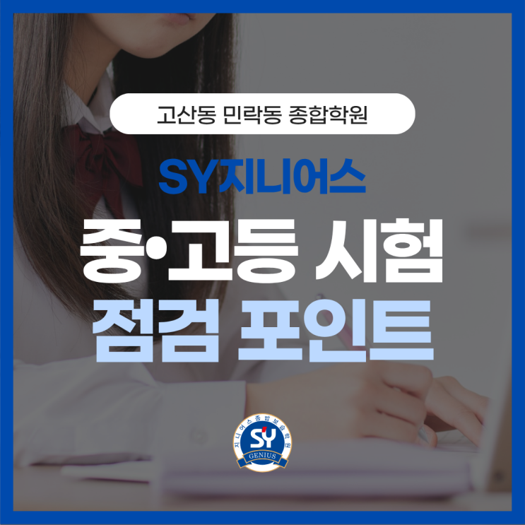 즐겁게 배우고 확실하게 성장하는 학습 습관! 민락동 종합학원, 초·중·고 전과목 종합학원 SY지니어스 안녕하세요 초·중·고 전과목 종합학원 SY지니어스입니다. 시험이 가까워질수록 학부모님들께서는 우리 아이가 무엇을 마지막으로 점검해야 하는지 가장 궁금해하십니다. 그래서 오늘은 의정부 고산동 종합학원 SY지니어스가 고등부 학생들에게 시험 직전 특히 강조하는 내용을 과목별로 정리해 드리겠습니다. 막연히 불안해하기보다, 지금 꼭 확인해야 할 포인트를 정확히 짚어보시길 바랍니다. 고등부 중간고사 직전, 왜 마지막 점검이 중요할까요? 시험 직전에는 새로운 내용을 많이 늘리기보다, 이미 공부한 범위를 얼마나 정확....... <img src="https://blogthumb.pstatic.net/MjAyNjA0MjJfNzIg/MDAxNzc2ODI2NTQ1Njk3.m7hrDFx5CJF41gx6Hq2Uw3w8N9cV6_co6qEtervt1r0g.cs3Uu7cd9N5AXy2HRpGStMeIyk3VhuOuK3E2z5zZ_MEg.PNG/1.png?type=s3" />