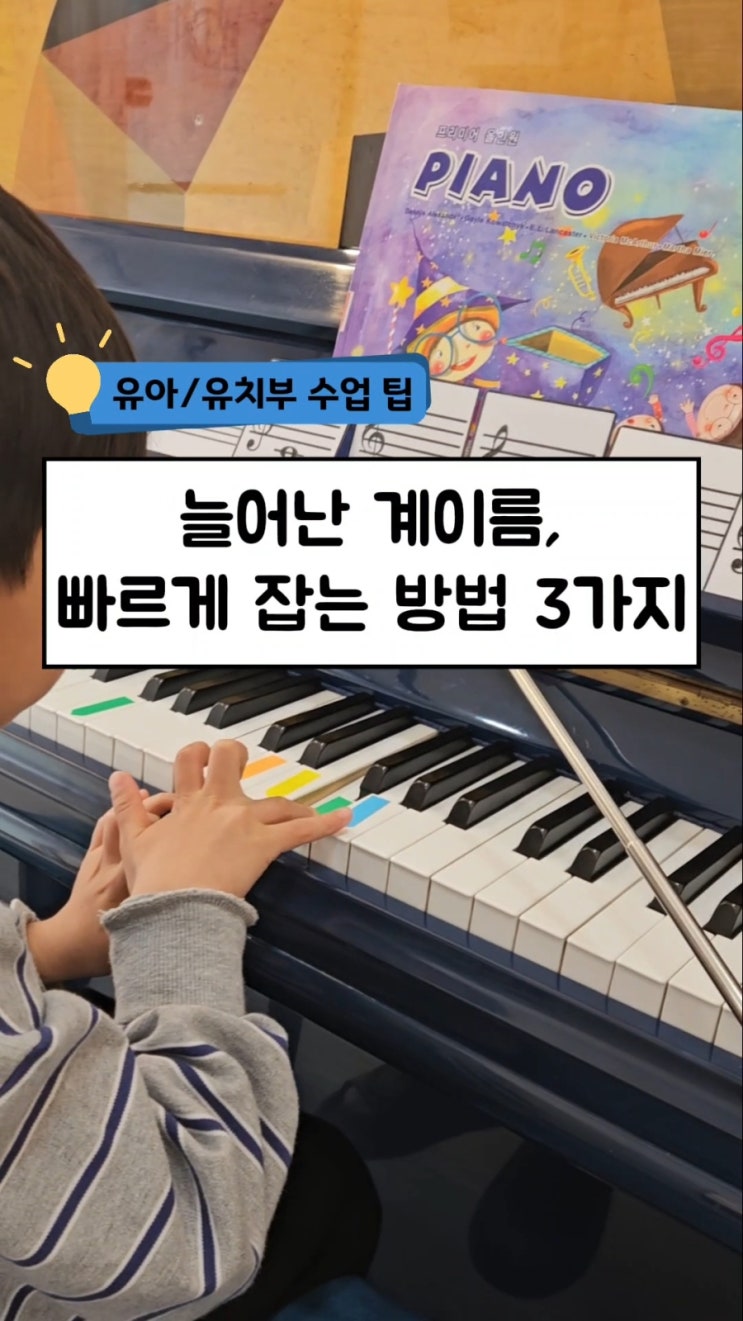 유아/유치부 수업팁! 계이름 익히는 3가지 방법 1. 건반 컬러링 → 눈으로 먼저 길을 만들어주면 손이 자연스럽게 따라옵니다 (초기엔 ‘보조바퀴’ 역할, 이후 점차 제거) 2. 공통 기준음으로 구분하기 → 가온도를 중심으로 위치 감각을 잡습니다 낮은음자리표 / 높은음자리표의 가온도를 왼손·오른손으로 나누어 치며 확실히 구분 3. 오선카드 활용 → 게임처럼 반복하면서 자연스럽게 암기 다양한 방식으로 변형해 지루함 없이 노출 결국 중요한 건 ‘많이’가 아니라 ‘어떻게’입니다! Music Studio Nol:Da | 놀다음악교습소 취미를 전공처럼, 배움을 놀이처럼 소수정원제 (주1-3회) | 개별 맞춤 커리큘럼 상담문의 ?....... <img src="https://blogthumb.pstatic.net/MjAyNjA0MjNfMTU0/MDAxNzc2OTA2MDc5MTUz.x7tH4EohBbHPuQh8EtRIeLIFBjDk1coIdLjD5950emgg.mojsd2n-mhPzHr1m-On0ppjZptPbpmwj23wxEF64kmIg.JPEG/900_lv_0_20260423095156.jpg?type=s3" />