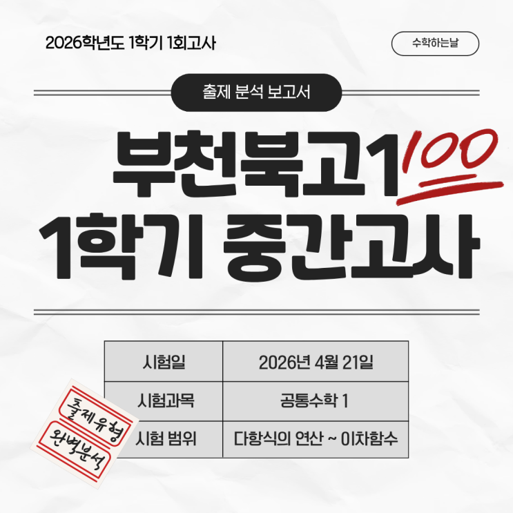 안녕하세요! 수학하는날입니다. 이번 시험, 원하던 점수를 받았나요? 이번 부천북고 수학 중간고사는 단순한 개념 이해를 넘어, 문제 해결 과정의 정확성과 속도를 함께 요구하는 시험이었습니다. 수학하는날에서는 실제 시험지를 기반으로 문항별 출제 의도를 분석했습니다. ✔ 왜 중위권 학생들이 어려움을 느꼈는지, ✔ 기말고사는 어떤 방식으로 대비해야 하는지 구체적으로 설명드리겠습니다. 시험구조와 난이도 분석 부천북고 1학년 수학시험은 총 22문항 중 선택형 20문항, 서술형 2문항으로 출제되었습니다 그리고 이 서술형 2문항이 전체 약 16점의 비중을 차지합니다 그래서 이번 시험은 ✅ 단순히 답만 맞히는 연습을 한 학생은....... <img src="https://blogthumb.pstatic.net/MjAyNjA0MjJfMjEg/MDAxNzc2ODU0NTMxMzIw.zC2QMOkRG2OPJZLm9j1GOzoUwgZlh87McfYi1Sdx10gg.blikjnIrlFLZ7UCKjfLUyhH-ESlP1NTEgrpFy1ZC9jIg.PNG/1.png?type=s3" />