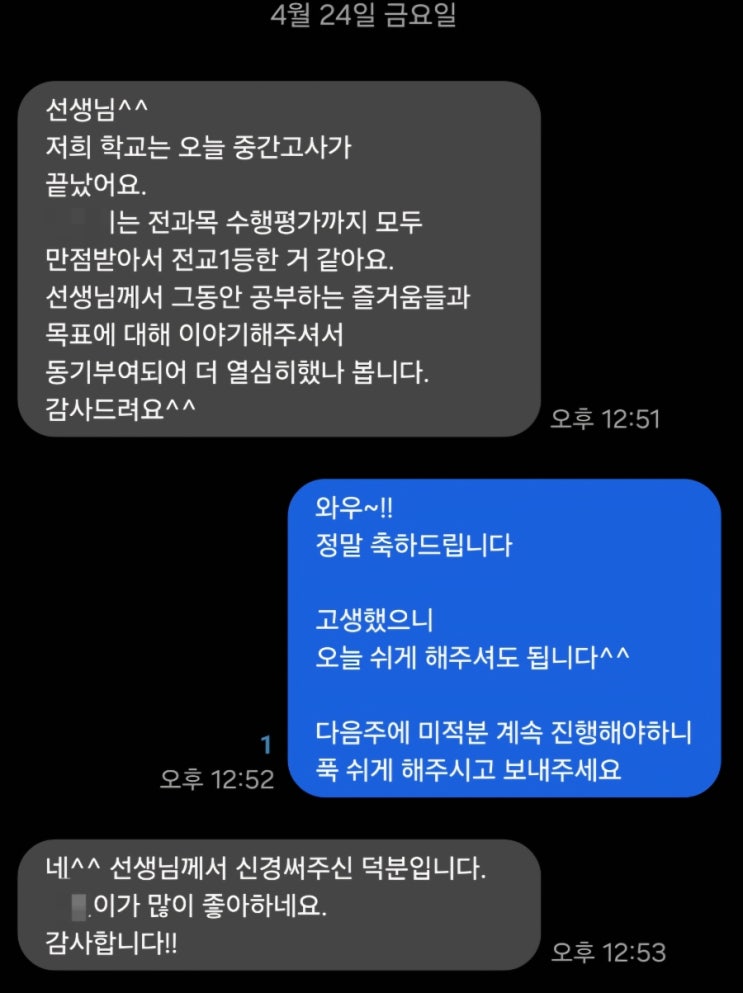 각 학교별 2026년 1학기 중간고사가 시작되었습니다 학생의 학습 동기부여를 통해 스스로의 잠재력을 깨워주는 일이 1차적 목표이고, 그만큼 따라주는 학생의 노력을 통해 학생의 미래를 함께 꿈꾸어 갑니다 아마도 이 학생은 특목자사고를 진학하게 될 것 입니다. 아론에듀학원장의 '픽' 입니다 잘 따라주어 고마울 따름입니다 <img src="https://blogthumb.pstatic.net/MjAyNjA0MjRfMTY3/MDAxNzc3MDE2MTMxODk5.AAscyjKHsi_aBfAgRaQ6n1FOBgNcO_lS-_1zrIQh5Tcg.W-3Doc24KVnAXuICz9kvWbonh89KFYST--lnaUke7bMg.JPEG/900_Screenshot_20260424_163411_Messages.jpg?type=s3" />