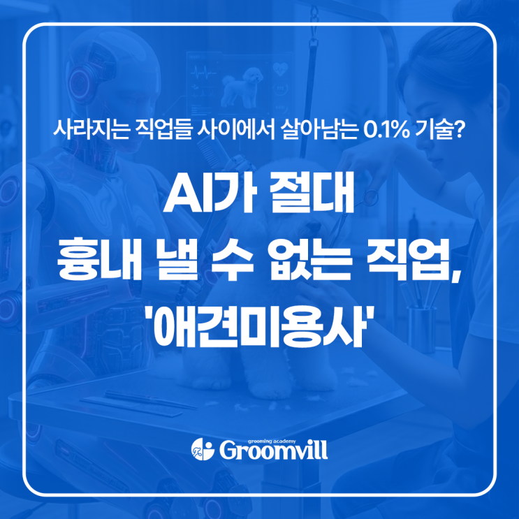 안녕하세요 펫뷰티 교육의 선두 주자 그룸빌애견미용학원입니다. 최근 인공지능 기술이 비약적으로 발전하면서 수많은 직업이 사라질 위기에 처해 있다는 뉴스를 자주 접하게 됩니다. 하지만 이런 시대 흐름 속에서도 기계가 결코 대체할 수 없는, 시간이 흐를수록 그 가치가 더욱 귀해지는 독보적인 영역이 있습니다. 바로 사라지는 직업들 사이에서 살아남는 0.1% 기술, '애견미용사'입니다. 오늘은 왜 애견미용이 미래에도 살아남는 강력한 기술인지, 그룸빌만의 시선으로 깊이 있게 담아보겠습니다! 왜 AI는 안 될까요? 많은 분이 궁금해하십니다. "로봇도 정교하게 깎을 수 있지 않나요?" 하지만 반려동물의 세계에....... <img src="https://blogthumb.pstatic.net/MjAyNjA0MjhfMTIz/MDAxNzc3MzY1MTU0OTAy.TjOPEU4CERVzv2PH6TECT4VoHhHW0ZVY13NaXjkIwcwg.jOYnkLnYXqseq1w0ukawMNoH-1uz-aTmZXM7_JWDph8g.PNG/1.png?type=s3" />