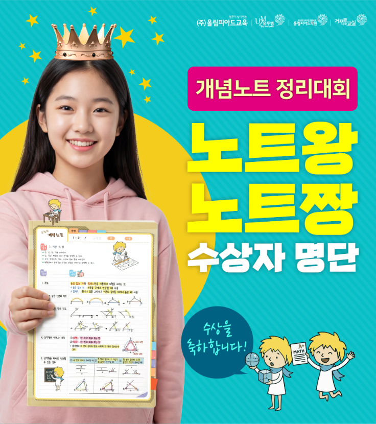 안녕하세요~(●'◡'●) 수학이 즐거워지는 과천 지정타 U2M 수학입니다!! 2026년 한 해 동안 학생들과 함께할 특별한 프로젝트, 올림피아드 수학 페스타를 소개합니다. 지난 블로그에 소개되었던 올수페*의 첫번째 개념노트 정리대회의 결과가 발표 되었습니다! *올수페는 그동안 학생들이 쌓아온 노력들을 실전에서 흔들리지 않는 실력으로 완성해가는 페스타입니다. 유투엠 수학의 개념노트의 핵심은 단순히 필기만하게 만드는 노트가 아닙니다. 학생이 직접 생각을 꺼내고, 정리하고, 말로 설명하는 힘을 정리하는 훈련장이 됩니다. 이 과정을 충분히 거친 학생은 개념을 본 적이 있는 정보가 아니라 실제로 활용 가능한 지식으로 바....... <img src="https://blogthumb.pstatic.net/MjAyNjA0MTBfMTAz/MDAxNzc1ODA2Nzc0ODkx.jCgd9i5ZIF7n2HelDlturEd7ww070_Ees6zLXGKD4w8g.hOxh8wkdwg82Qj-CedSeyDx2wMnKTp6fd8mfdxo79fgg.PNG/1.png?type=s3" />