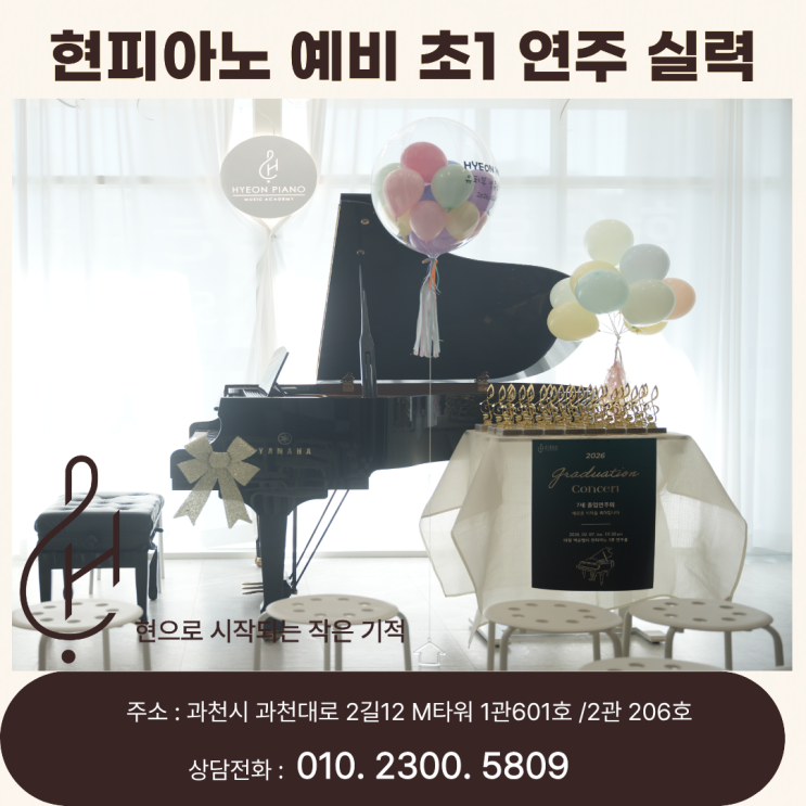안녕하세요. 과천 피아노 학원 현피아노 입니다. 오랜만에 우리 아이들 연주 이야기를 전해드려요. 이번에 소개할 친구들은 현피아노 최고 귀염둥이인 예비 초등학교 1학년을 소개하려 합니다. 과천 피아노 학원 ' 7세 피아노 아이의 첫 음악, 그리고 성장의 시작 ' 아직은 손도 작고 집중 시간도 길지 않은 예비 초등학생 1학년 7세였던 아이들이 단 두 달이라는 시간 동안 한 곡을 스스로 완성해냈습니다. 처음에는 낯설고 어려웠던 악보를 하나하나 익혀가며, 틀려도 다시 도전하고 포기하지 않고 끝까지 연습해낸 그 시간들이 고스란히 연주에 담겨 있었어요. 사실, 유치부 친구들은 악보 읽기부터 많은 시간이 걸려요. 악보가 다....... <img src="https://blogthumb.pstatic.net/MjAyNjA0MTJfMjgz/MDAxNzc1OTY2ODY4ODA1.PRyp5JcwFa3Ay4Lnr2PpoJdY25gRrSHb0IP7Etzw9vEg.tMyrw-HvuW3Jeq69g8JFsukUlkjvgt-1zvXnFMVoZeIg.PNG/%C1%A6%B8%F1%C0%BB_%C0%D4%B7%C2%C7%D8%C1%D6%BC%BC%BF%E4._%282%29.png?type=s3" />