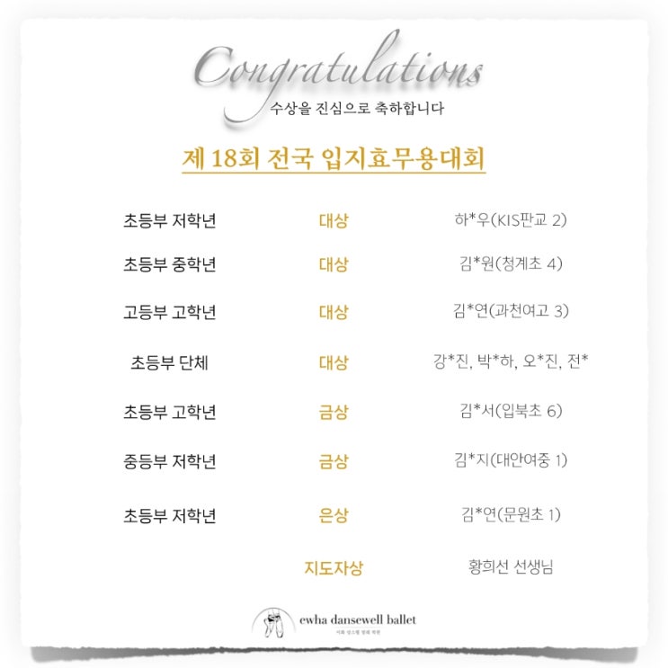 영재입시전문발레학원 과천이화당스웰 축 콩쿨 전원 수상(지도자상)