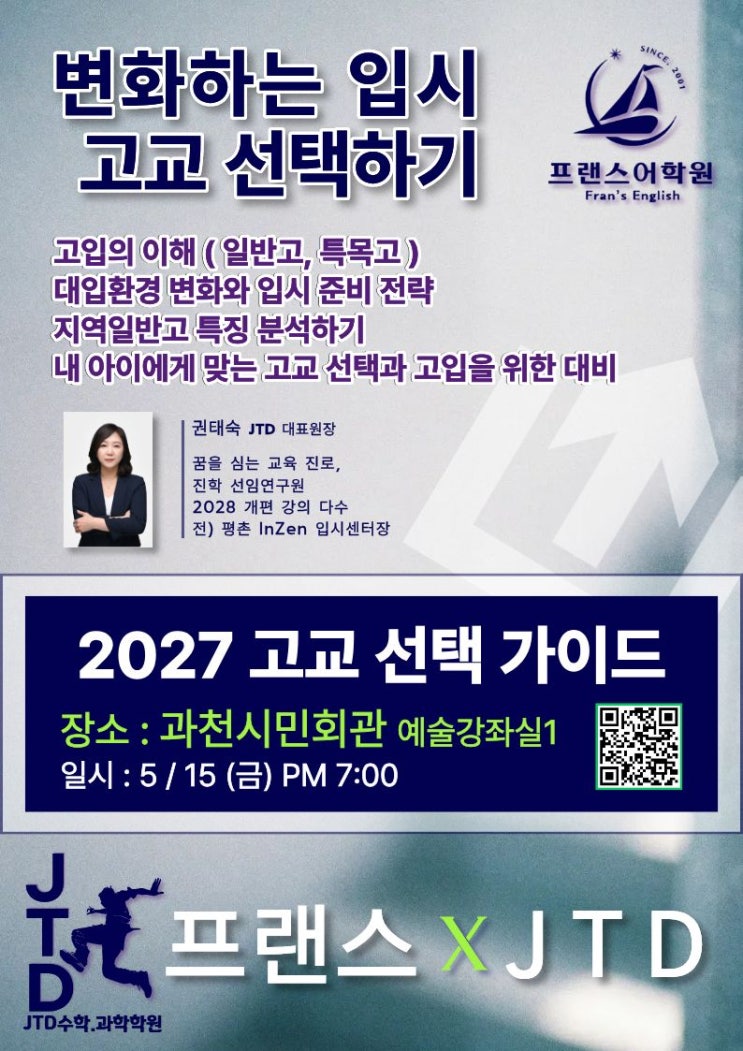 프랜스어학원 x JTD수학과학 2027 고교 선택 전략 설명회<과천시민회관 ㅣ 선착순마감>
